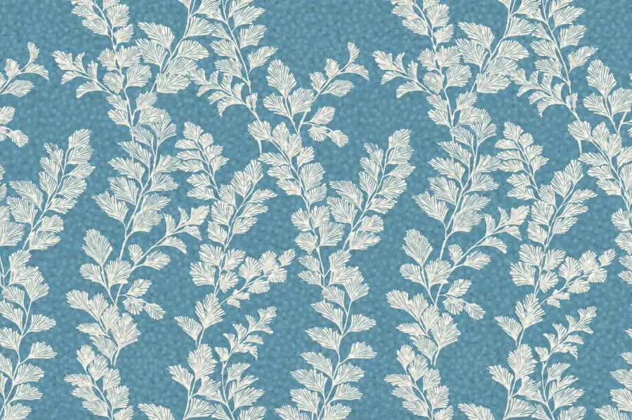 Fotobehang Patroon van witte bladeren op een blauwe achtergrond (SKU: w02784v2)