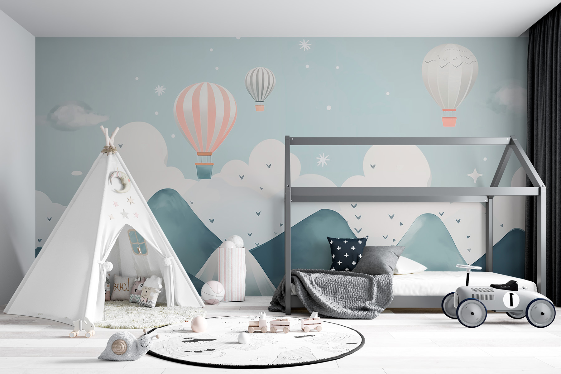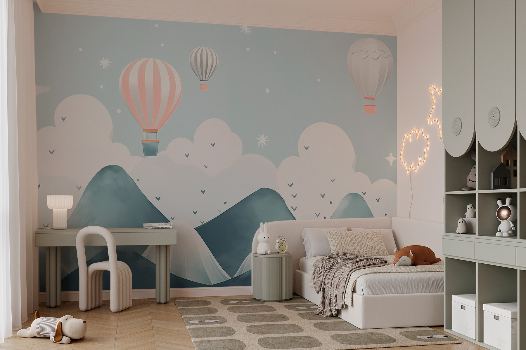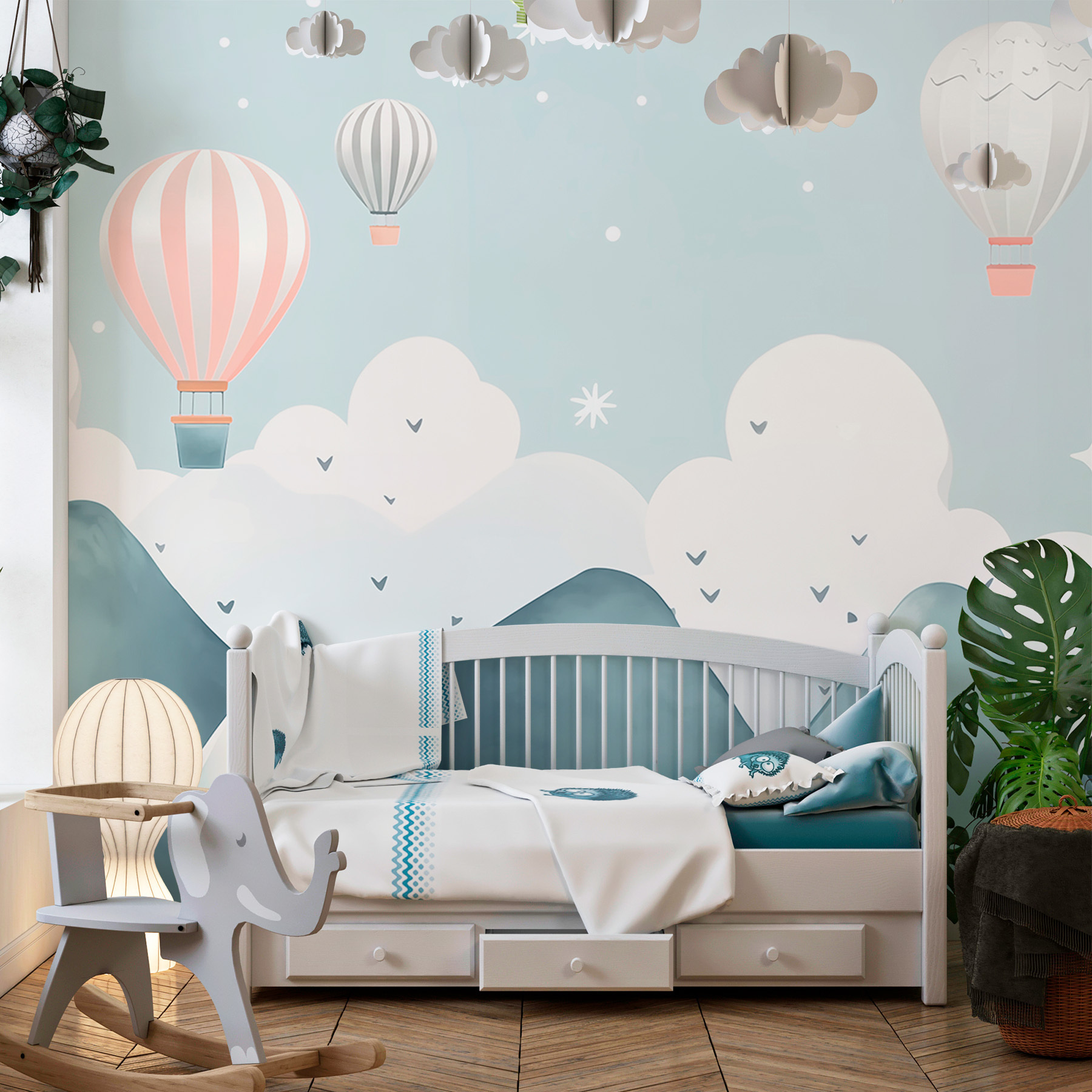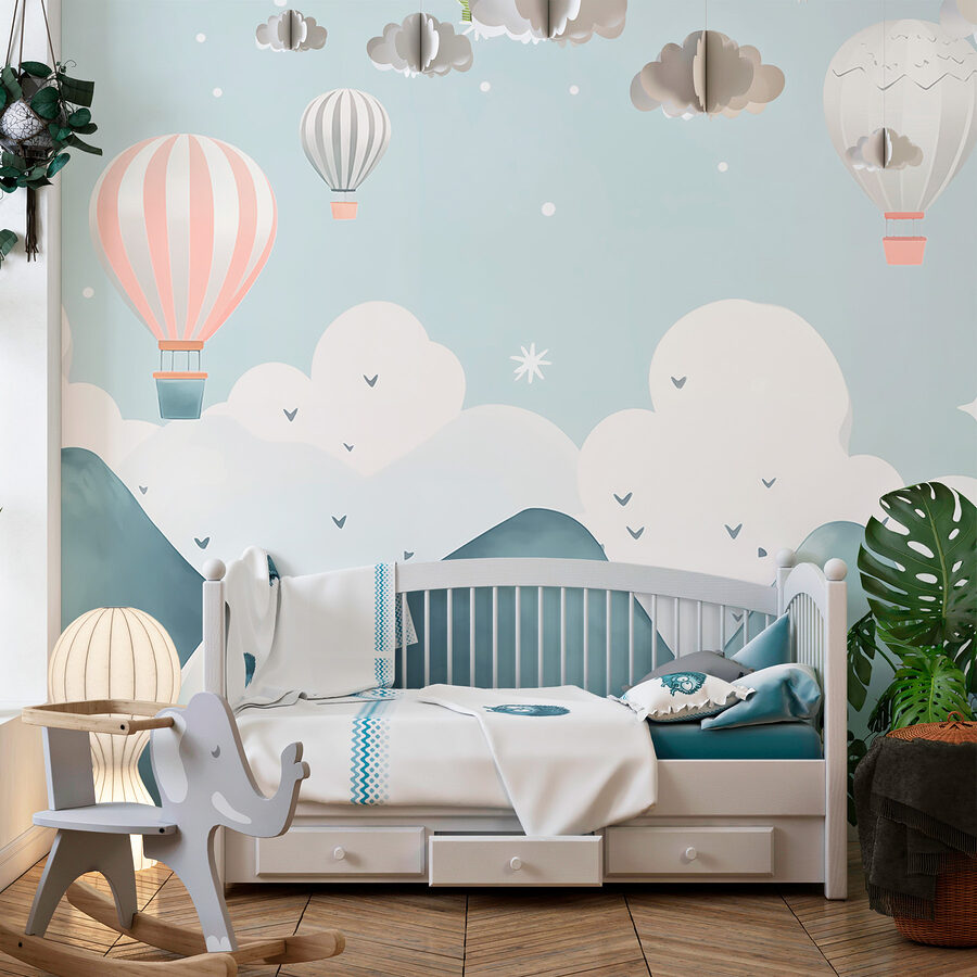 Verfraai je ruimte met deze betoverende muurschildering met heteluchtballonnen die sierlijk over dromerige bergen zweven. Stel je voor dat je elke dag wakker wordt met dit serene tafereel – het is alsof je in een aquarelschilderij stapt! De zachte blauwtinten en zachte kleuren nodigen uit tot rust en zijn daarom perfect voor een gezellige woonkamer of een rustige slaapkamer. Stel je een luie zondag voor met een kop koffie, het daglicht dat naar binnen schijnt, terwijl je dagdroomt over zweven tussen de wolken. Voeg een vleugje eigenzinnigheid toe aan je muren en misschien inspireert het wel tot avontuur! Wie weet, misschien begint de muur wel zoete ontsnappingsplannen te fluisteren.