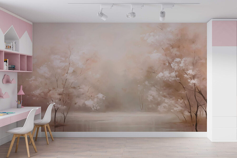 Stel je voor dat je een serene oase binnenstapt met deze muurschildering, “Water met bomen en een mistige lucht”. Het is alsof je een zacht gefluister van de natuur op je muur hebt, een zacht aquarel droomlandschap dat je geest onmiddellijk kalmeert. Stel je luie ochtenden voor met een kopje koffie terwijl je naar die tere bloesems kijkt die door de mist gluren. Zachte tinten creëren een gezellige sfeer die perfect is om tot rust te komen na een lange dag. Het is niet alleen decor; het is een mini-vakantie voor de ogen. Vrienden zouden zelfs kunnen vragen of ze hun schoenen uit moeten doen als ze binnenstappen!