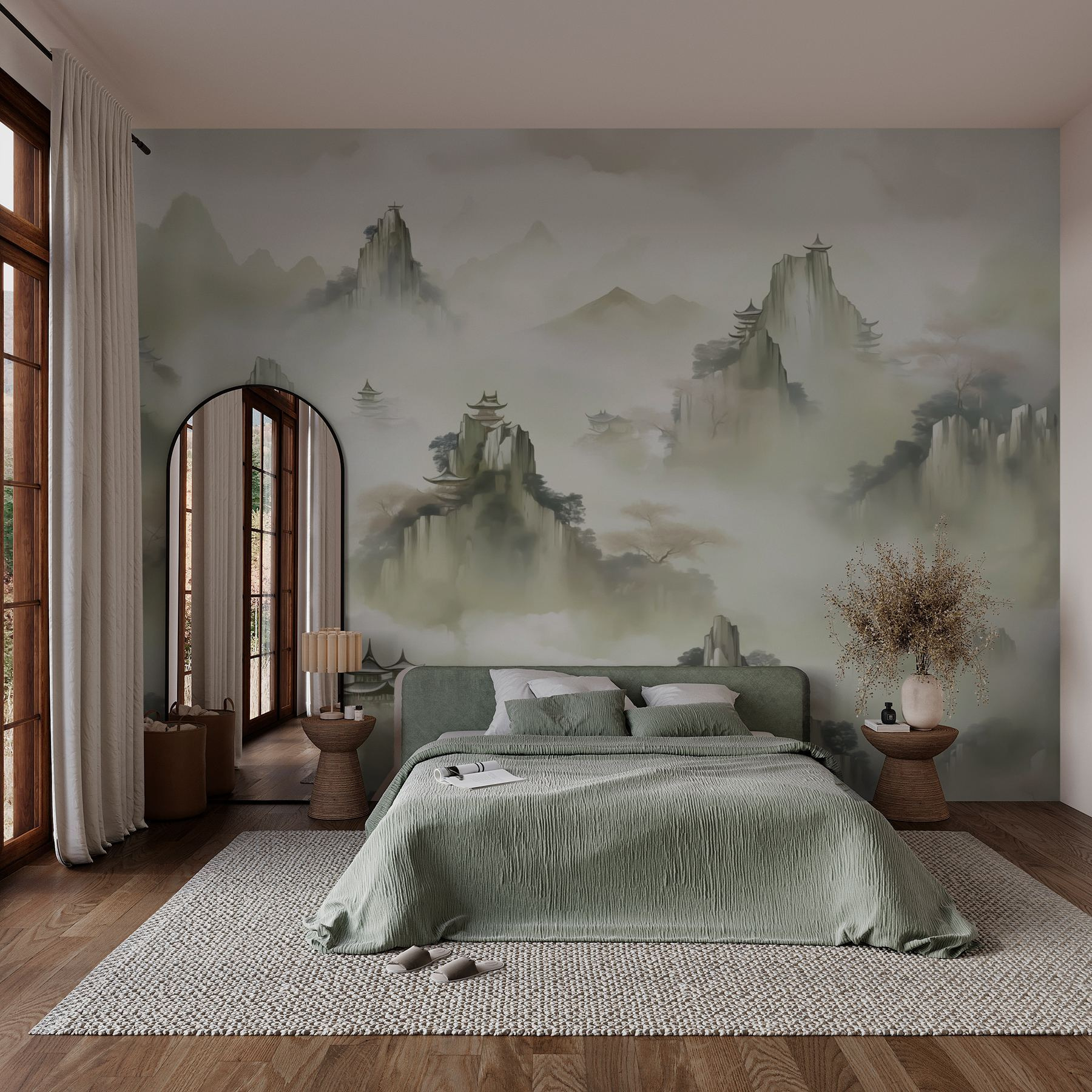 Verander elke kamer in een serene toevluchtsoord met deze prachtige muurschildering van een dromerig landschap. Stel je voor: mistige bergen rijzen gracieus op in de achtergrond terwijl delicate bomen zachtjes wuiven in de wind. Dit meesterwerk in aquarel is niet alleen een decoratie, het is een uitnodiging om te ontspannen en je fantasie de vrije loop te laten. De zachte tinten creëren een rustgevende sfeer die je het gevoel geeft dat je thee drinkt in een vredig bergretraite – geen wandelschoenen nodig! Of het nu in een gezellige woonkamer of een rustige slaapkamer is, deze muurschildering fluistert: “Ontspan, je bent thuis.” Perfect voor wie houdt van een vleugje kunstzinnigheid in zijn of haar ruimte.