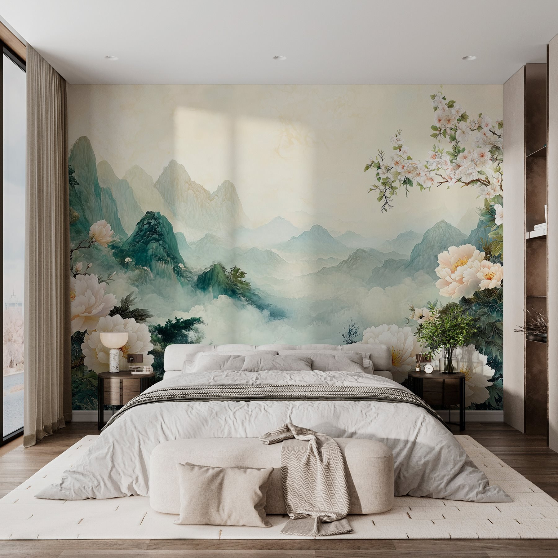 Transformeer je kamer met deze betoverende muurschildering met delicate bloemen en majestueuze bergen. Stel je voor dat je een kamer binnenloopt waar zachte bloemen geheimen van serene tuinen lijken te fluisteren, terwijl verre bergtoppen een gevoel van avontuur oproepen. Stel je voor dat je je ontspant op de bank, genietend van een kopje thee en je voelt je alsof je in een rustige Japanse tuin bent. Deze muurschildering is niet alleen kunst, maar brengt de rust van de natuur binnen en nodigt uit tot warmte en verwondering. Of het nu een gezellig hoekje is of een levendige woonkamer, het voegt karakter toe en geeft vreugde bij elke blik. Een gespreksonderwerp? Absoluut!