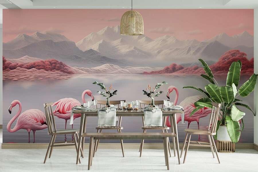 Haal een stukje paradijs in huis met deze prachtige muurschildering van twee elegante flamingo’s die gracieus in rustig water staan. De zachte pastelkleuren en het dromerige landschap voeren je mee naar een tropisch toevluchtsoord zonder dat je je woonkamer hoeft te verlaten. Stel je voor dat je ‘s ochtends van je koffie nipt terwijl je naar dit serene tafereel kijkt – het is als een kleine vakantie voor je muur! Deze muurschildering is perfect voor wie gelooft in de kalmerende kracht van de natuur en verandert elke ruimte in een mini-oase. Bovendien, wie wil er nu geen flamingo’s in huis die pronken met hun stijl? Ze kunnen je zelfs inspireren tot vrolijke danspasjes – ik zeg maar wat! Het gaat niet zozeer om perfectie, maar meer om die sfeer die je doet glimlachen.