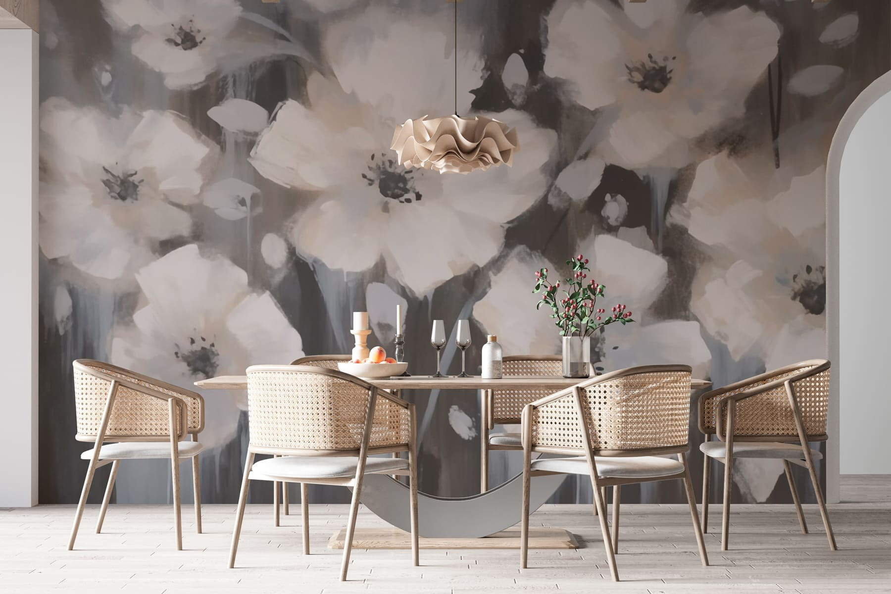 Stel je voor dat je je nestelt in je gezellige hoekje, met een kopje thee in je hand, en je laat overspoelen door de rustige sfeer. Deze muurschildering is niet alleen decoratief, maar helpt ook een sfeer te creëren en verandert een gewone muur in een dromerige achtergrond. Perfect voor woonkamers, slaapkamers of die lege muur die om wat aandacht smeekt. Wie had gedacht dat witte bloemen net zo betoverend konden zijn als een avondje uit? Ze zijn de stijlvolle, ingetogen metgezellen die je ruimte nog miste.