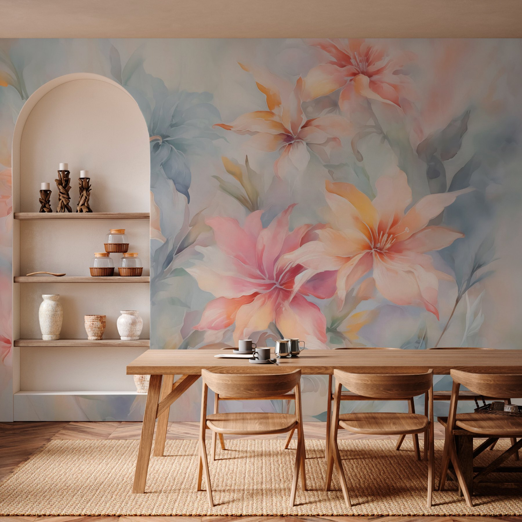 Transformeer elke ruimte met deze prachtige muurschildering met een prachtig boeket bloemen. Het is alsof je een tuin in huis haalt zonder dat je je zorgen hoeft te maken over water geven! De zachte aquarelstijl wervelt in zachte tinten en creëert een sfeer die kalm en uitnodigend is, perfect voor een knus hoekje of een levendige woonkamer. Stel je voor dat je thee drinkt terwijl je je koestert in de schoonheid – wie zou zich niet geïnspireerd voelen? Bovendien is het ook een geweldige gespreksstarter. Vrienden zullen niet alleen bloemen zien, ze zullen het gevoel hebben dat ze in een dromerige dagdroom stappen. De natuur is binnen handbereik!