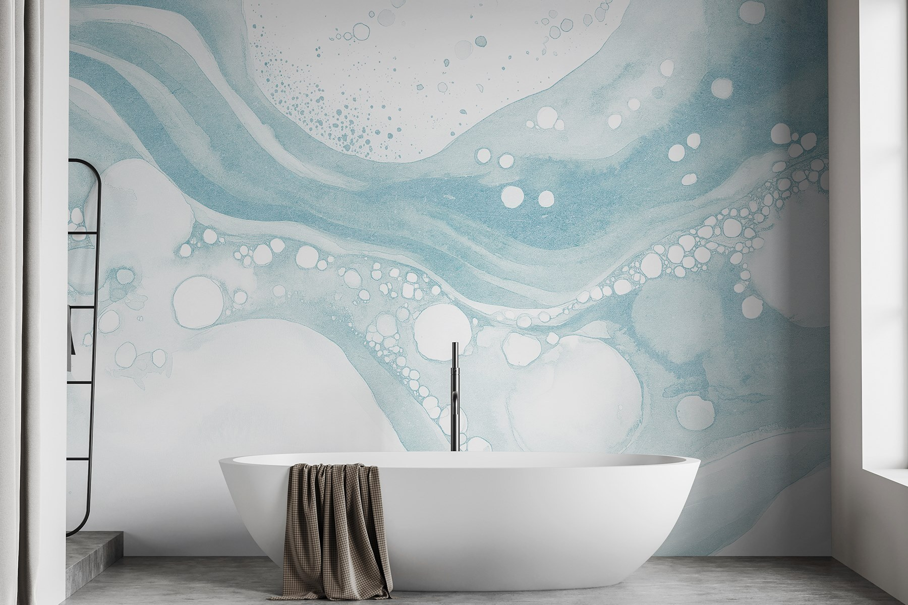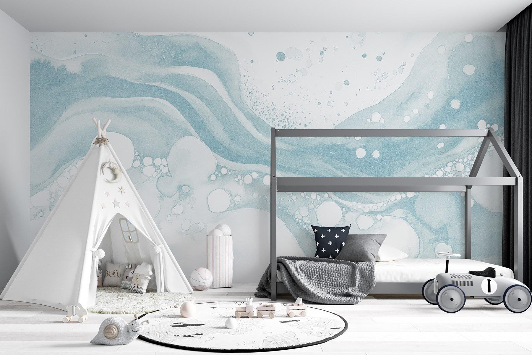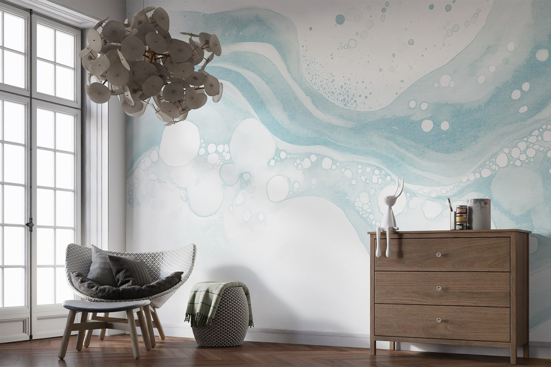 Transformeer je ruimte met deze muurschildering, een dromerige mix van witte en blauwe aquarelverf die doet denken aan een zachte zeebries gevangen op canvas. Stel je voor dat het een gezellige leeshoek opfleurt of een drukke woonkamer een vleugje rust geeft. De zachte rondingen en speelse bubbels nodigen uit tot dagdromen over luie stranddagen en kalmeren de zintuigen. Het is bijna alsof de muurschildering fluistert, “Haal diep adem, ontspan je”. Perfect voor natuurliefhebbers of iedereen die hunkert naar een vleugje sereniteit in huis. Stel je voor dat je thee drinkt terwijl deze muurschildering je muren opfleurt – wie zou die sfeer niet willen?