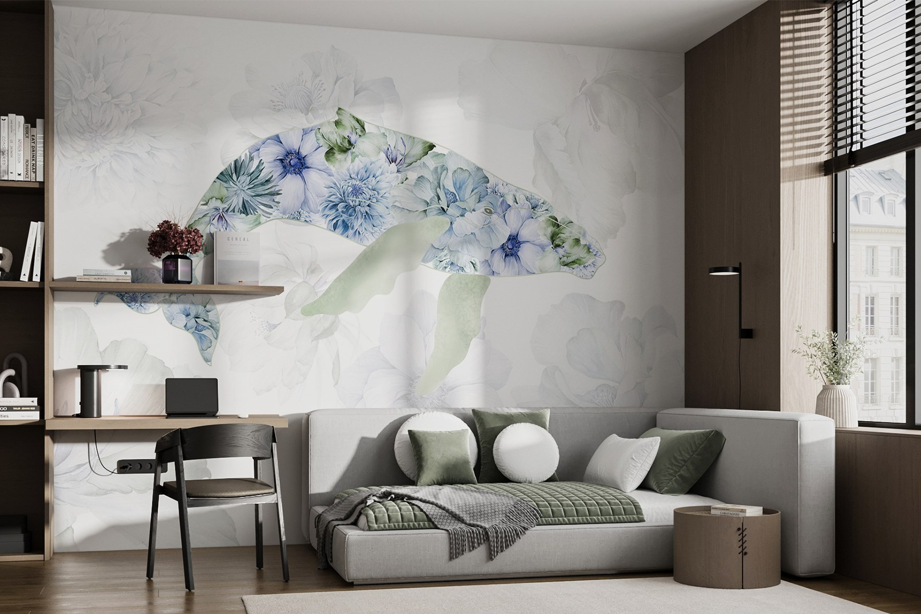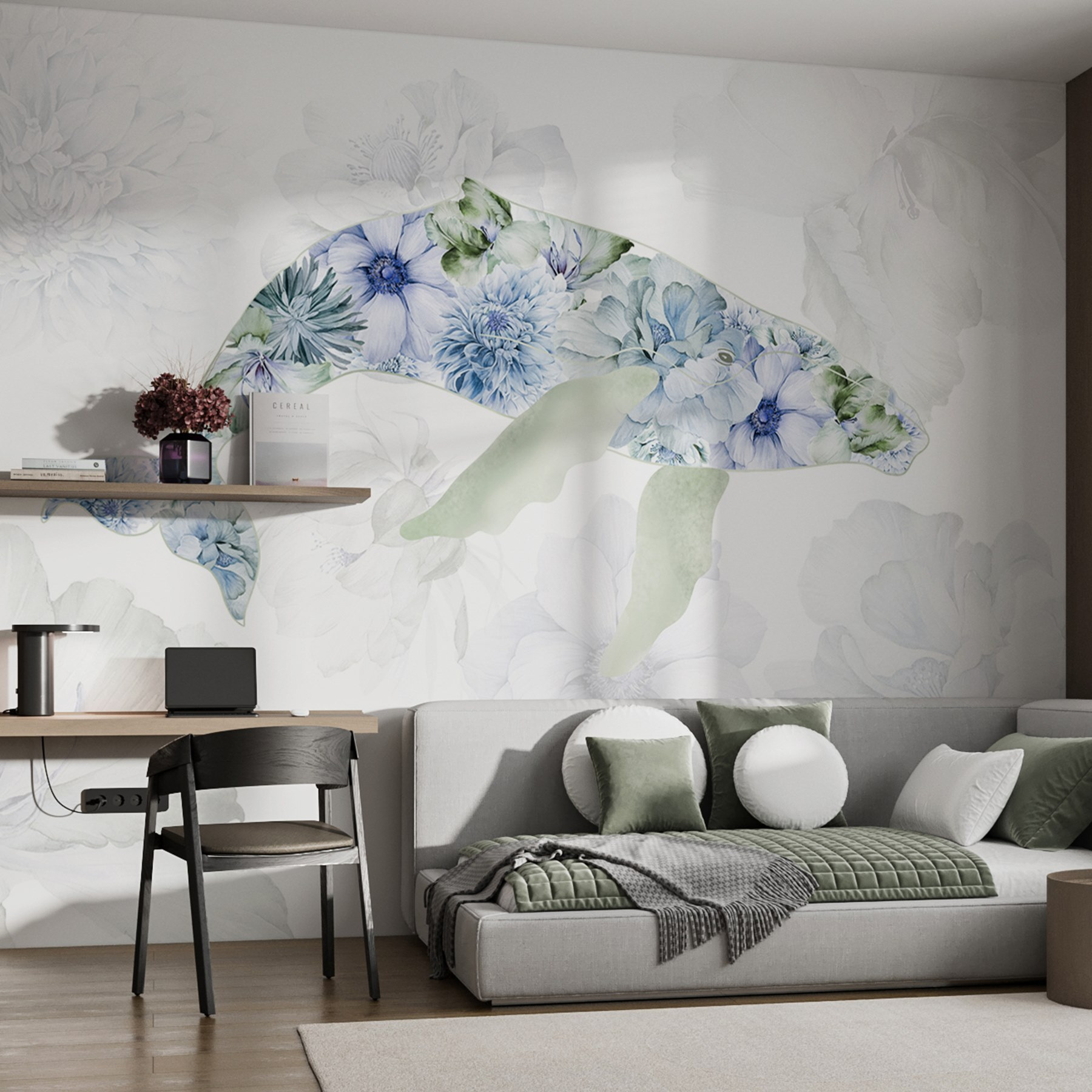 Transformeer je kamer met deze betoverende muurschildering met een walvis vol speelse bloemen. Stel je voor dat je een kamer binnenstapt en meteen de rust van de zee en de grilligheid van een tuin voelt. De zachte tinten en delicate bloemblaadjes nodigen uit tot een zachte, serene sfeer, perfect voor een gezellige leeshoek of zelfs een speelse kinderkamer. Het is alsof je een stukje natuur aan je muur hebt hangen, met de vreugde van het oceaanleven en de bloemenpracht. Stel je voor dat vrienden je bewonderen en vragen waar je zo’n juweeltje hebt gevonden. Duik erin en laat de muurschildering je muren leven inblazen!