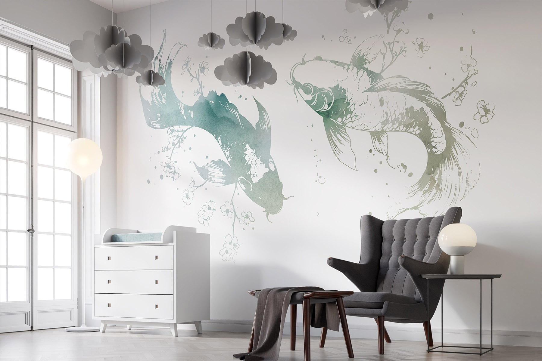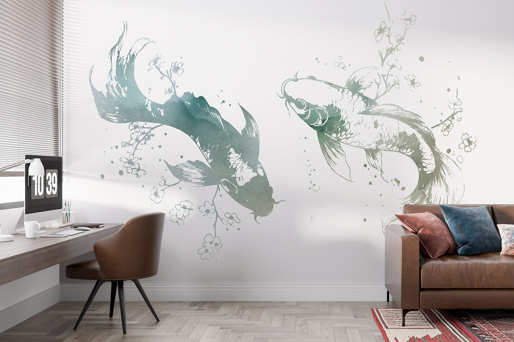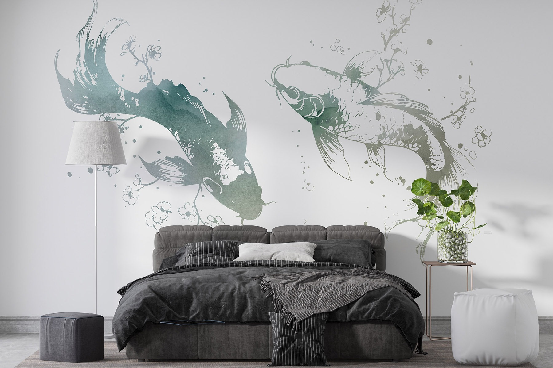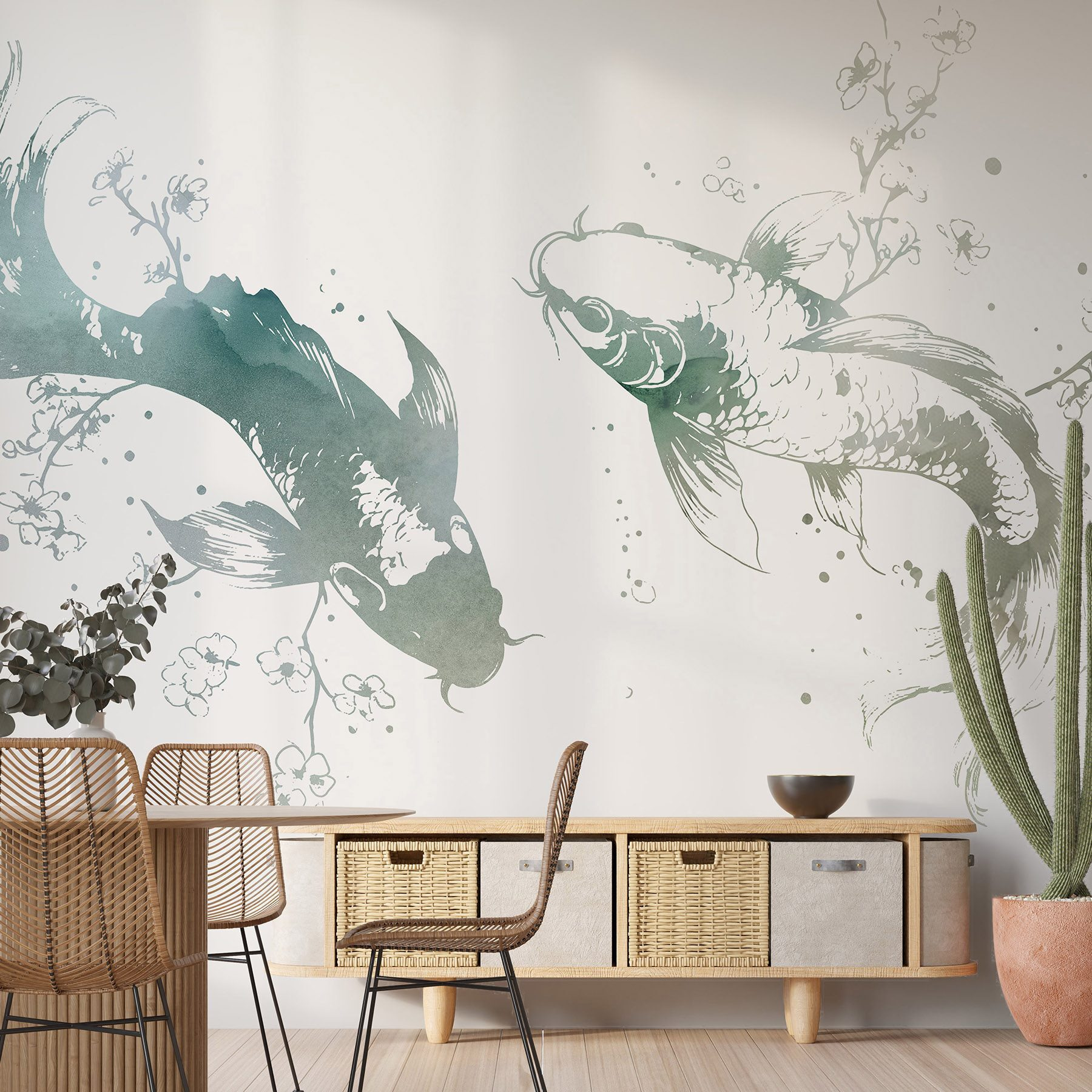Transformeer je ruimte in een serene ontsnapping met deze fascinerende muurschildering met twee sierlijke vissen omringd door delicate bloemen en bladeren. Stel je voor dat je de kamer binnenloopt en daar zijn ze, glijdend door zachte aquarellen die je muren leven inblazen. Het is alsof je een klein stukje natuur in huis hebt, dat bij elke blik een gevoel van rust oproept.