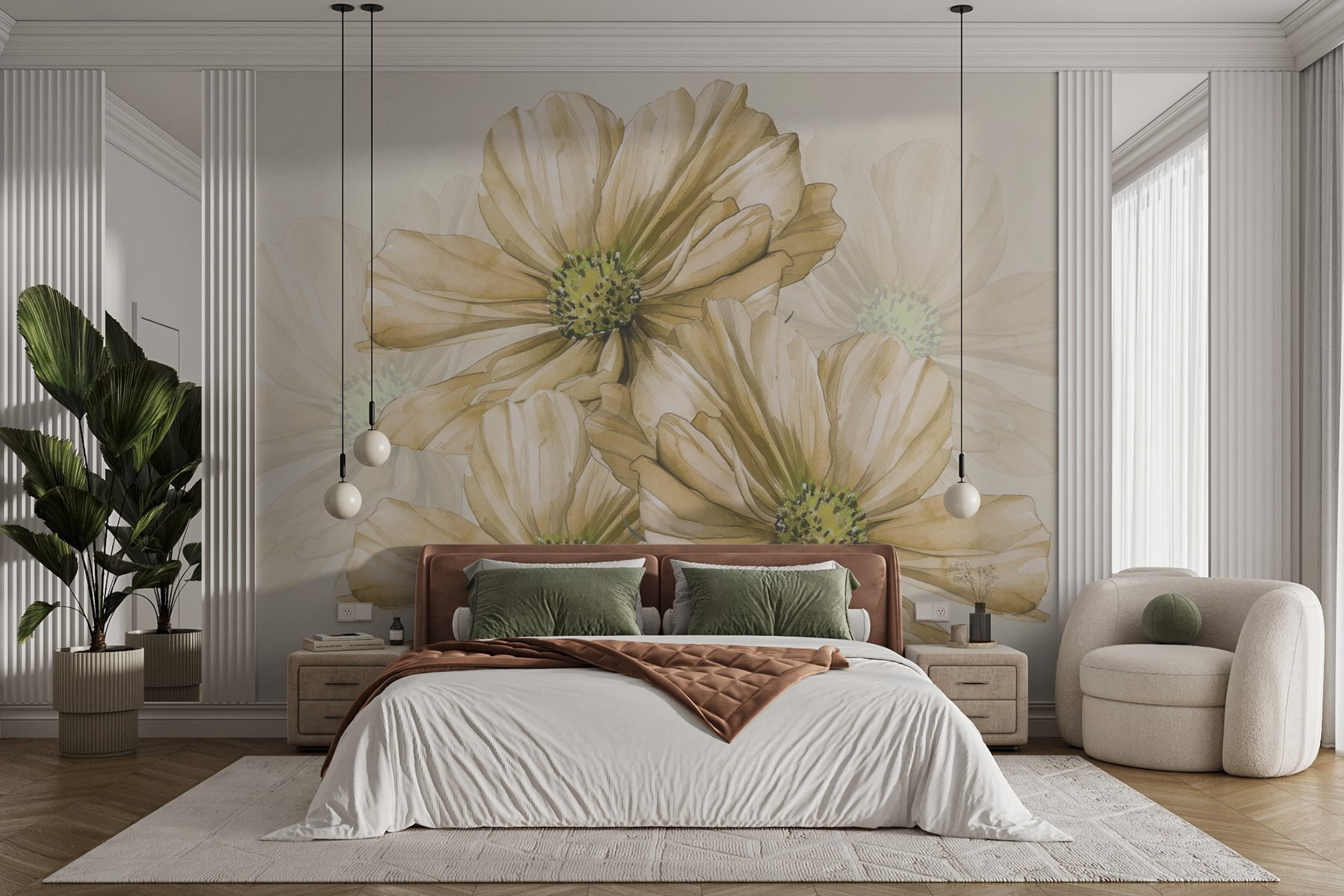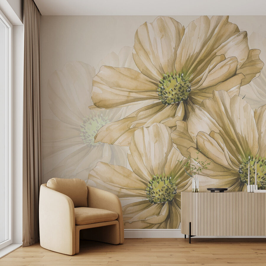 Tover elke ruimte om in een sereen toevluchtsoord met deze muurschildering met een fascinerende groep bloemen. Zie die delicate bloemen met hun charmante groene hart zachtjes wiegen in een briesje – het is alsof je een frisse tuin in huis hebt. Ideaal voor natuurliefhebbers of iedereen die een vleugje kalmte wil, deze aquarelkunst brengt je naar zonnige dagen en warme vibes. Stel je voor dat je thee drinkt terwijl je naar deze muurschildering staart en laat je verbeelding een wandeling maken door droomvelden. Het is meer dan decor, het is een uitnodiging om te ontspannen en adem te halen. Omarm de schoonheid en laat het je dag opfleuren.