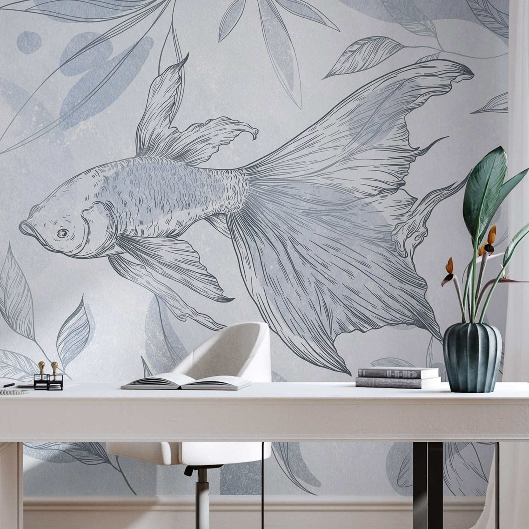 Duik in een serene onderwaterwereld met deze charmante muurschildering met een mooie vis die tussen delicate planten glijdt. Het is net alsof je een persoonlijke aquatische scène hebt die een rustige sfeer toevoegt aan elke kamer. Stel je voor dat je ‘s ochtends aan je koffie nipt en dit lieflijke diertje zwemt in het zicht en fleurt de ruimte meteen op. De zachte aquarelstijl voelt aan als frisse zeelucht en geeft een zachte, uitnodigende touch. Perfect voor een gezellig hoekje of zelfs een speelse kinderkamer, het fluistert rust uit en prikkelt de nieuwsgierigheid. Wie wil er nou geen vismaatje aan de muur?