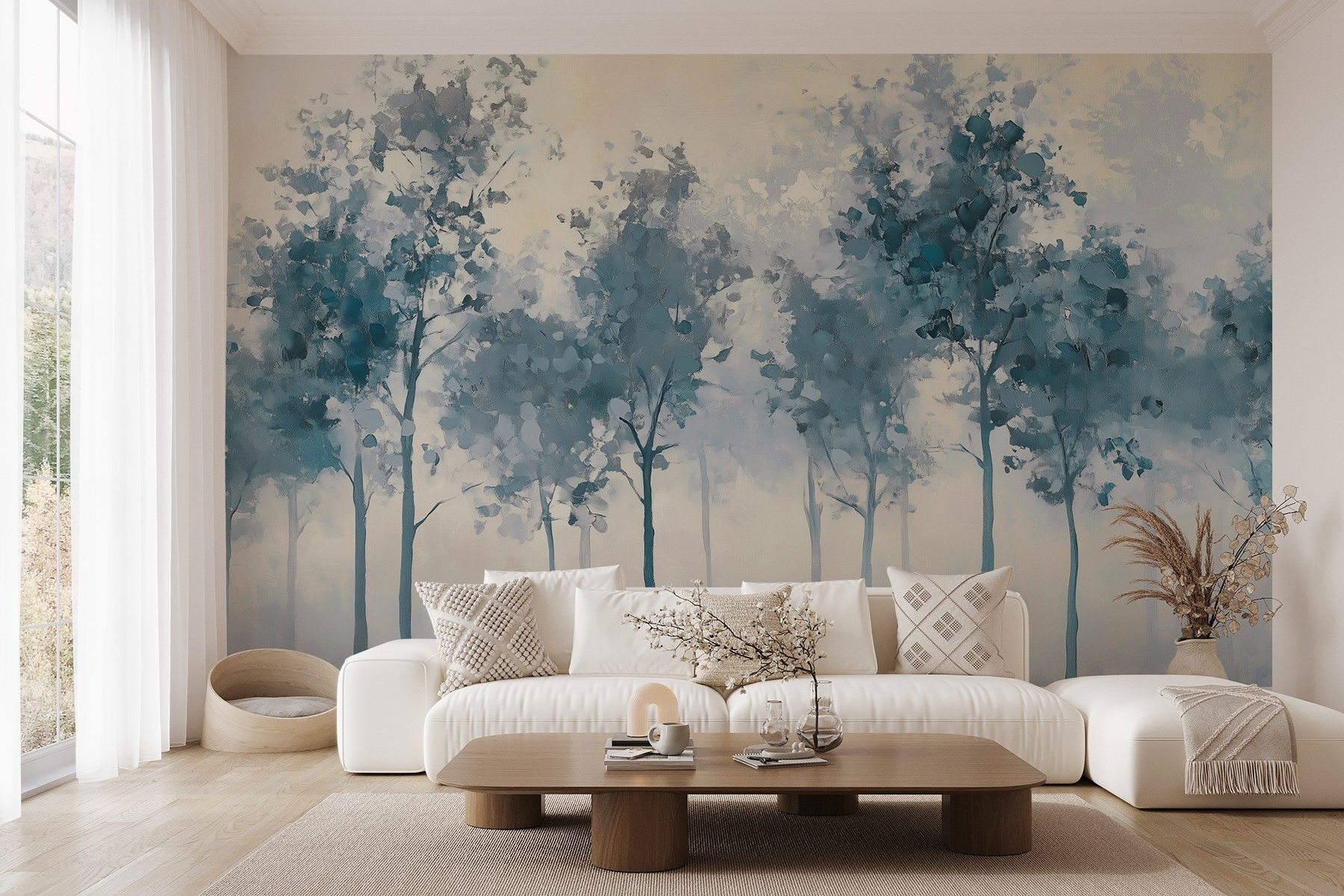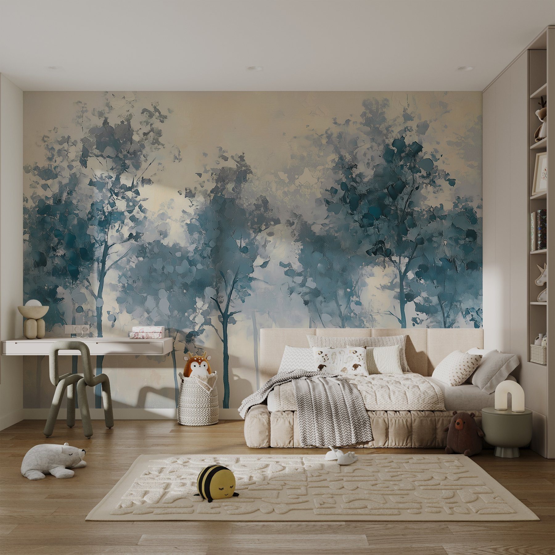 Stel je een sereen bos voor waar bomen rechtop staan, in stilte gehuld in mist. Deze muurschildering, “Groep bomen in mist”, legt dat magische moment perfect vast. Zacht blauw en zacht groen gaan naadloos in elkaar over en creëren een dromerige achtergrond die de ziel tot rust brengt. Het is alsof je een stukje natuur in huis haalt zonder dat je water hoeft te geven. Zie het voor je in een gezellige leeshoek, waar je kunt ontsnappen met een boek en een warme kop thee. Elke blik voelt als een vredig toevluchtsoord, dat elke ruimte verandert in een rustgevend toevluchtsoord – wandelschoenen zijn niet nodig. Perfect voor natuurliefhebbers of iedereen die een beetje rust in huis wil.