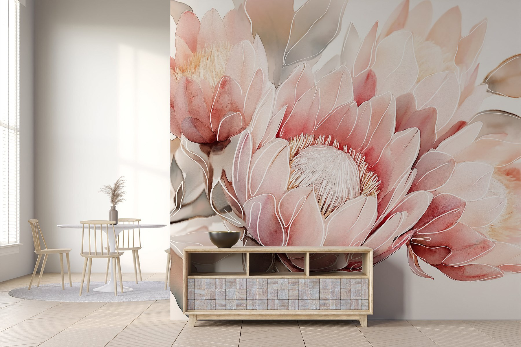 Maak kennis met “Delicate Petals in Soft Hues”, een muurschildering die een subtiele tuin in je interieur brengt. Stel je voor dat je een kamer binnenloopt en meteen die zachte, rustgevende sfeer voelt, zoals op een zachte lentemorgen. De pastelkleuren dansen samen en roepen gevoelens van warmte en rust op. Stel je voor dat je thee drinkt terwijl je tegen een muur leunt die versierd is met deze prachtige bloemen – het is alsof je een wolk van bloemen omhelst. Perfect voor een gezellige leeshoek of een serene slaapkamer, de lichte toets van deze muurschildering kan elke gewone muur veranderen in een dromerige ontsnapping. Neem het jezelf niet kwalijk als je merkt dat je aan het dagdromen bent.