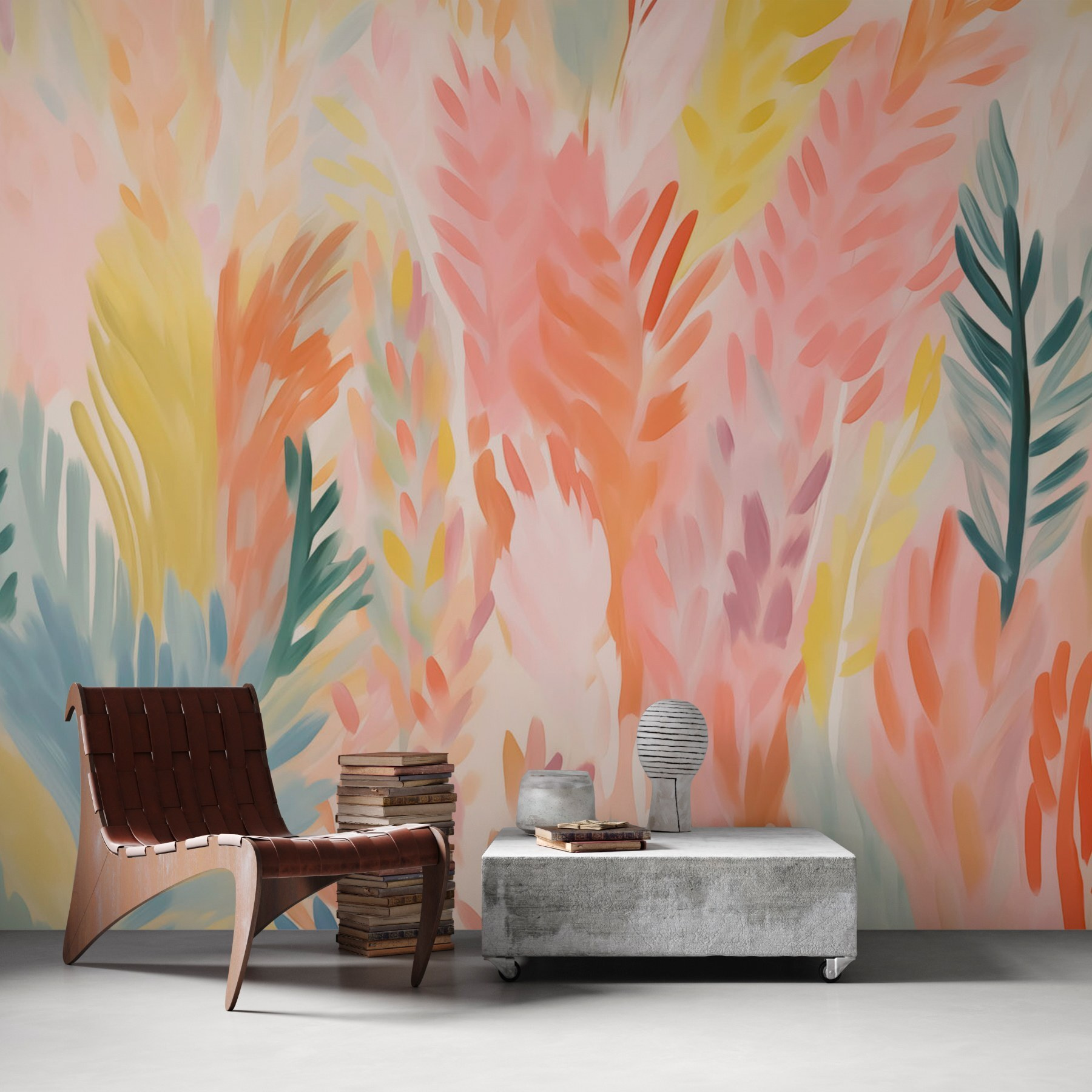 Verander een saaie muur in een levendige jungle van kleur met deze betoverende muurschildering met kleurrijke bladeren op een zacht witte achtergrond. Stel je voor dat je een zonnige tuin binnenstapt telkens als je de kamer binnenloopt. De speelse tinten roze, groen en geel geven je meteen een oppepper, als een goed humeur besprenkeld met een beetje magie. Dit ontwerp is perfect voor elke ruimte en geeft vreugde en verbeelding – wie weet inspireert het zelfs tot een grillig theekransje! Haal het buitenleven naar binnen en laat de schoonheid van de natuur je huis leven inblazen. Het leven is tenslotte te kort voor saaie muren!
