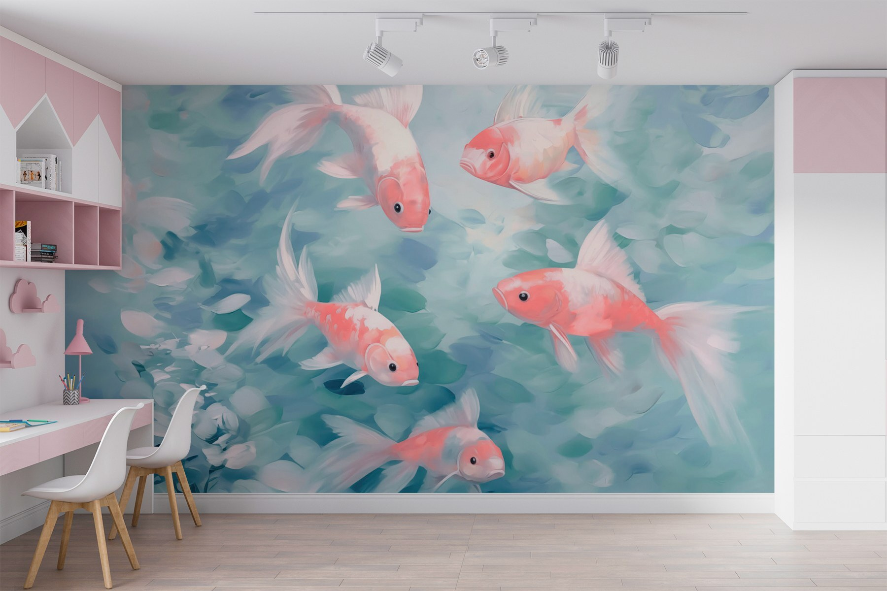 Verander een saaie muur in een levendige onderwaterwereld met de muurschildering “Swirling Fish”. Stel je voor dat je een dromerig aquarium in je woonkamer binnenstapt. Deze charmante vissen zwemmen door rustgevende blauwtinten en zachte groentinten en creëren zo een vredige sfeer. Deze muurschildering is perfect voor een kinderkamer of een gezellig hoekje en nodigt uit tot dagdromen en rustige momenten. Stel je luie middagen voor, waar je thee kunt drinken en naar deze speelse wezens kunt staren. Het is meer dan alleen decor; het is alsof je een sereen stukje natuur in huis haalt. Wie zou zich niet gelukkiger voelen met een beetje zwemgezelschap?