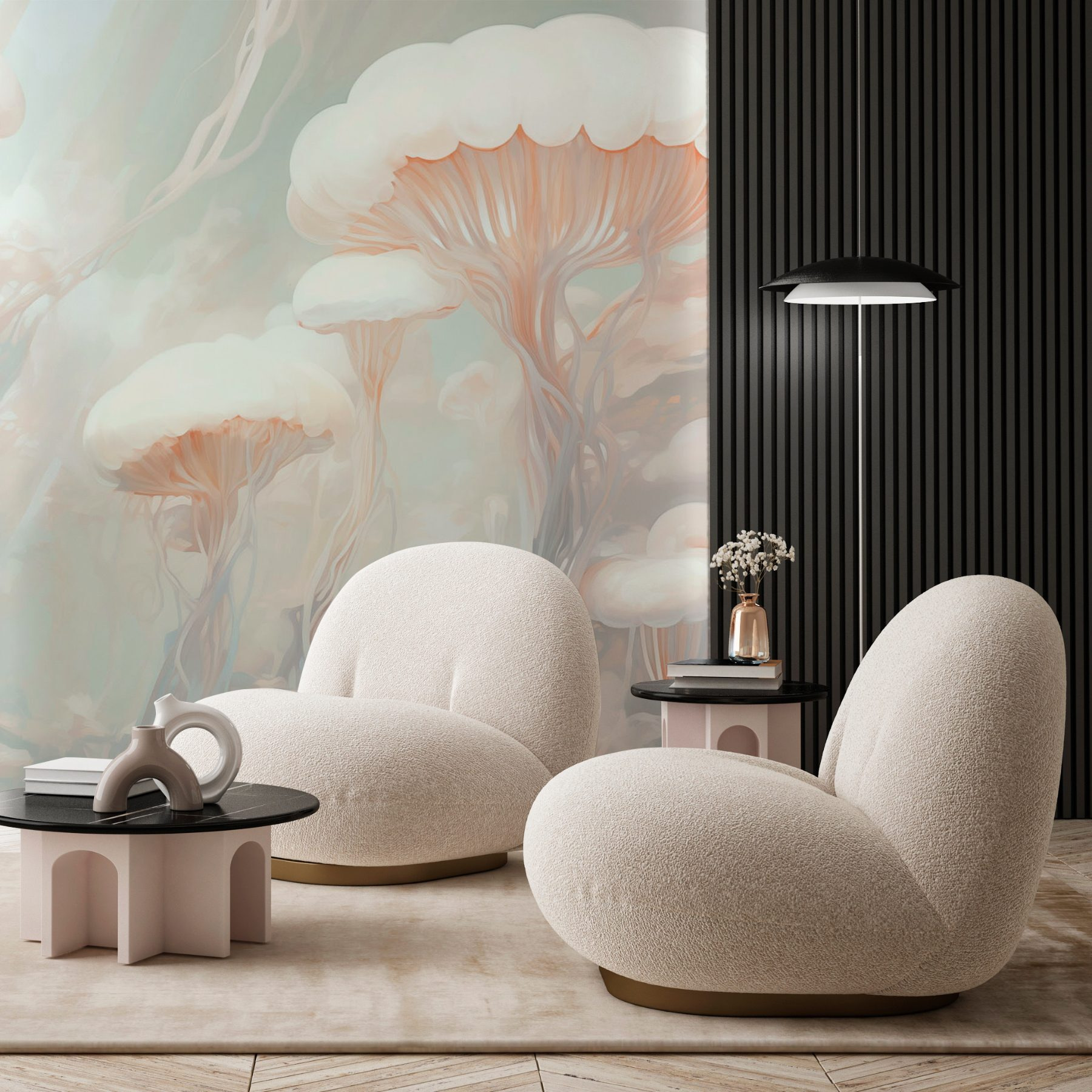 Transformeer een kamer met de betoverende allure van de muurschildering “Groep witte paddenstoelen”. Stel het je voor: een dromerig landschap van grillige paddenstoelen die gracieus wiegen als een dansfeest voor de natuur. De zachte kleuren versmelten als een aquarelschilderij en geven een serene sfeer die ontspanning uitstraalt. Deze muurschildering is ideaal voor een gezellig hoekje of zelfs een eigenzinnige keuken en geeft iedereen het gevoel alsof ze in een sprookje zijn binnengestapt. Stel je voor dat je hier thee drinkt, omringd door deze grillige charme, en de zorgen van alledag laat wegdrijven als een zacht briesje. Het is meer dan alleen maar decor; het is een ervaring die staat te wachten om zich te ontvouwen.