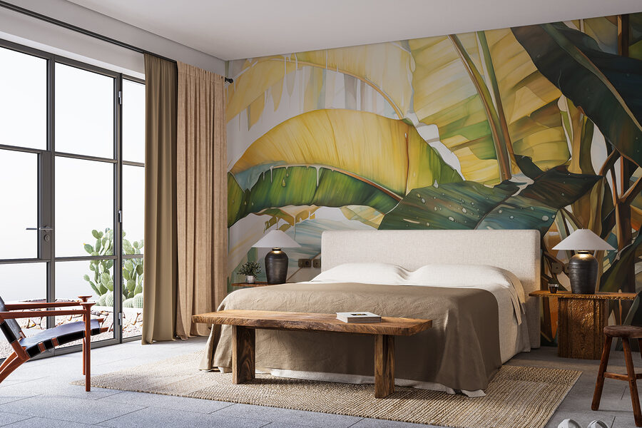 Het detail is ongelofelijk – elk blad lijkt wel te wiegen in een zacht briesje. En de manier waarop de kleuren in elkaar overlopen? Dromerig. Het is net alsof je thuis je eigen stukje tropen hebt, zonder de vliegreis. Of je nu de woonkamer wilt opfleuren, een stoer statement wilt maken in de slaapkamer of een vredige sfeer wilt creëren op je werkplek, deze muurschildering is er voor jou. Bovendien heeft die houtlooktextuur iets gezelligs en rustieks.