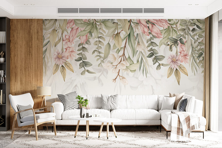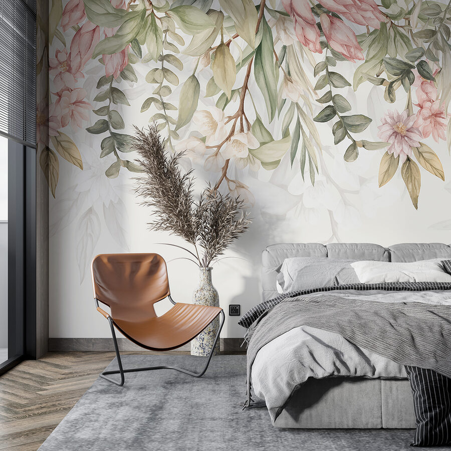 De mix van zacht roze en subtiel groen creëert een rustgevende en uitnodigende sfeer – perfect voor een luie zondagochtendkoffie of een avond ontspannen met een goed boek. Het geeft je het gevoel alsof je een botanische schets binnenstapt, met net dat juiste vleugje frisheid en sereniteit. Denk aan de dagen dat je gewoon omringd wilt zijn door schoonheid en eenvoud – dan is deze muurschildering iets voor jou.