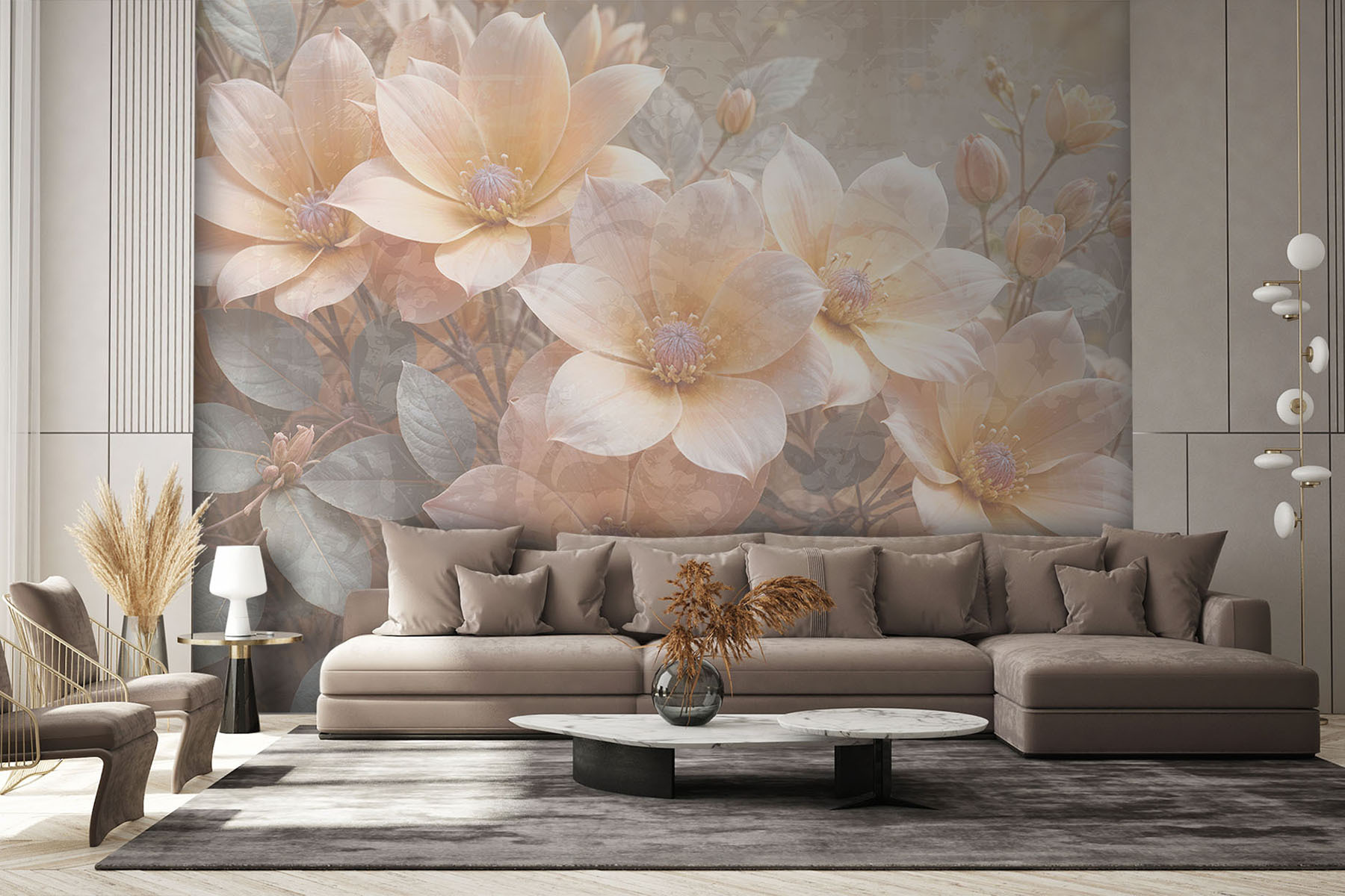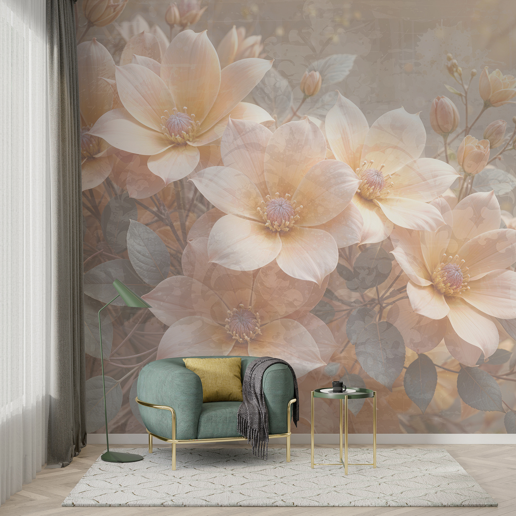 Verander elke kamer in een dromerige ontsnapping met deze muurschildering met een mooie groep bloemen tussen delicate bladeren. Stel je voor: je loopt een ruimte binnen met warme, zachte kleuren en opeens voelt het het hele jaar door als lente. De aquarelstijl zorgt voor een zachte toets, bijna alsof de bloemen hun geheimen fluisteren. Stel je voor dat je lekker wegkruipt met een goed boek, terwijl de bloemen je omringen met comfort. Het is niet zomaar decoratie; het is een ervaring, een klein stukje natuur bij je thuis. Perfect voor dagdromers en natuurliefhebbers, het laat je glimlachen en misschien zelfs een beetje inspiratie opdoen. Wie wist dat muren zo levendig konden zijn?
