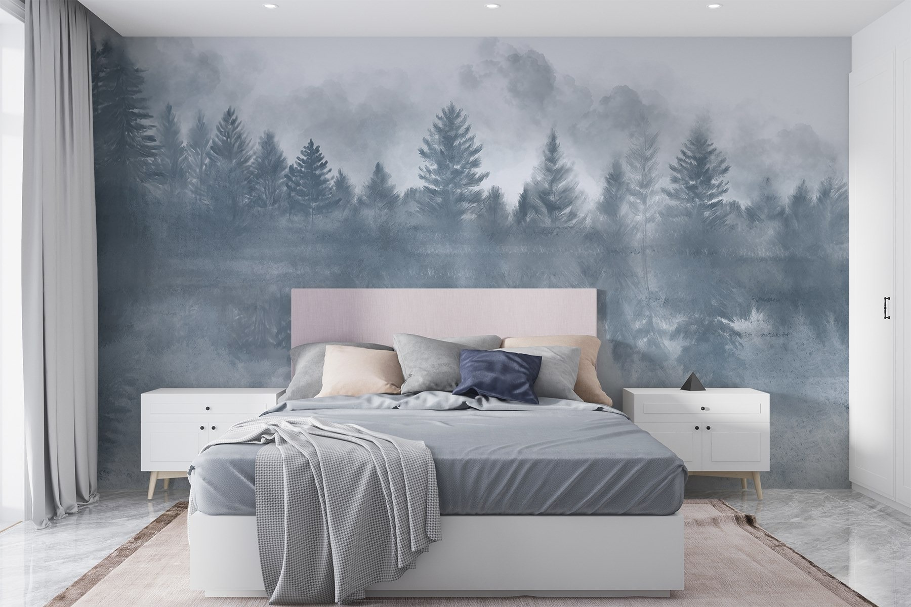 Stap in een serene ontsnapping met de muurschildering “Mistig bos met bomen weerspiegeld in water”. Dit prachtige kunstwerk verandert elke muur in een oase van rust en doet denken aan die perfecte ochtendwandeling door een mistig bos. Stel je het zachte gefluister van de bladeren voor en het zachte, weerspiegelende oppervlak van het water – oh, gelukzaligheid! De subtiele blauwe en grijze tinten nodigen uit tot kalmte, perfect voor gezellige leeshoekjes of serene slaapkamers. Het is alsof je een stukje natuur in huis hebt, zonder modderige laarzen. Wie wil dat nou niet? Het is ook een geweldige gespreksstarter. “Oh, dat? Gewoon mijn uitzicht op het bos!” Instant ontspanning gegarandeerd! Perfect voor natuurliefhebbers en unieke decoraties – voeg een vleugje eigenzinnigheid toe aan je muren!