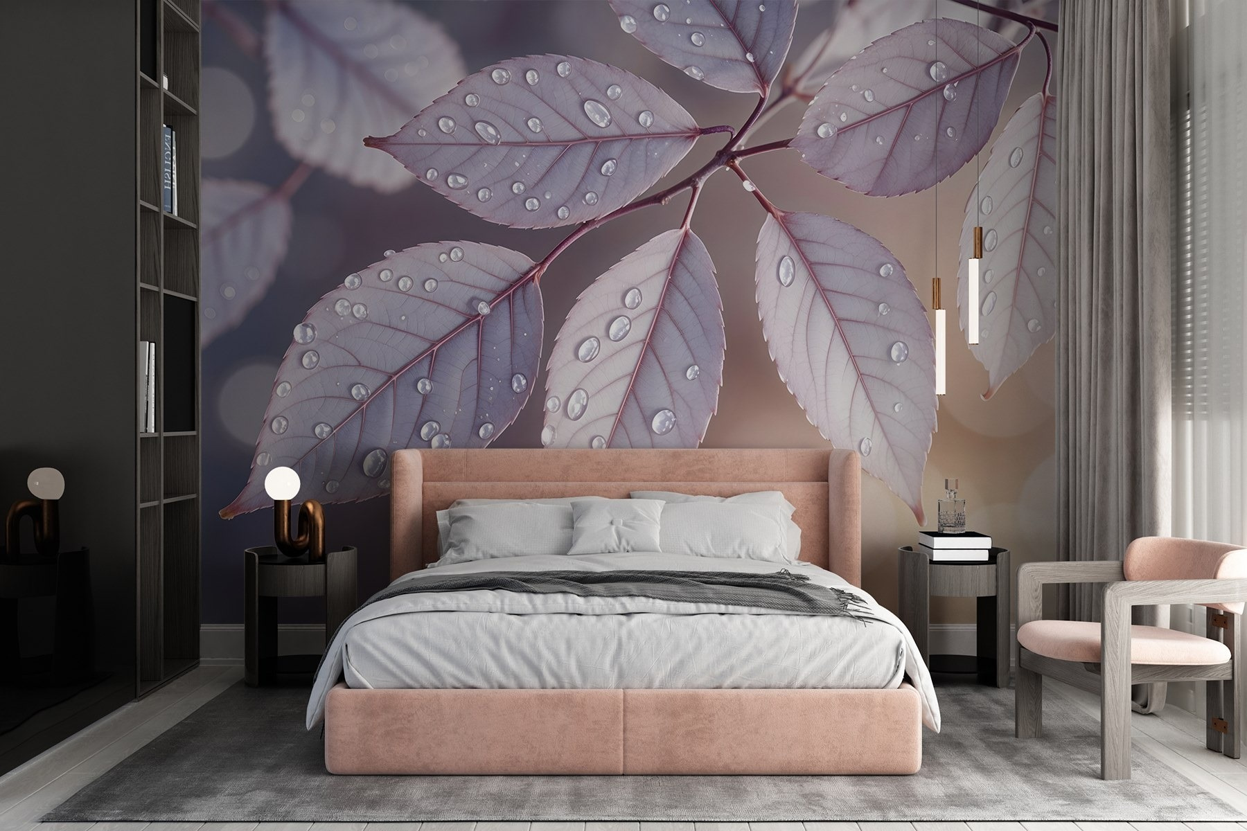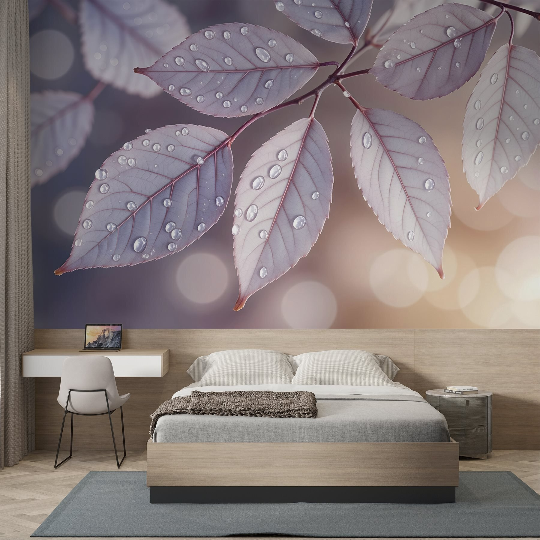 Transformeer je ruimte met deze prachtige muurschildering met delicate bladeren versierd met regendruppels. Het is alsof je een stukje natuur in huis haalt, zonder de modderige schoenen! Stel je voor dat je je kamer binnenloopt en bam! Je wordt elke dag begroet door dit rustgevende tafereel. Het zachte aquareleffect voegt een dromerig tintje toe en creëert een gevoel dat zowel sereen als verfrissend is.