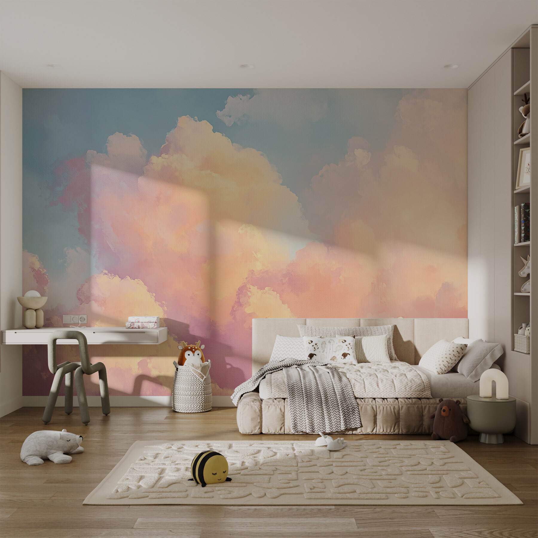 Verander elke kamer in een dromerige ontsnapping met deze muurschildering van “Kleurrijke wolken in de lucht”. Het is alsof je een stukje paradijs aan je muur hebt hangen! Stel je voor dat je wakker wordt met zachte pastelkleurige wolken die ontspanning fluisteren in plaats van je wekker. Dit prachtige ontwerp voegt een vleugje sereniteit toe, perfect voor een gezellige leeshoek of een levendige kinderkamer. Combineer het met een comfortabele stoel en een kopje thee en je hebt je persoonlijke cloud nine. Elke blik is een zachte herinnering om wat lichter door het leven te zweven. Waarom laat je je muren niet een verhaal van rust en creativiteit vertellen?