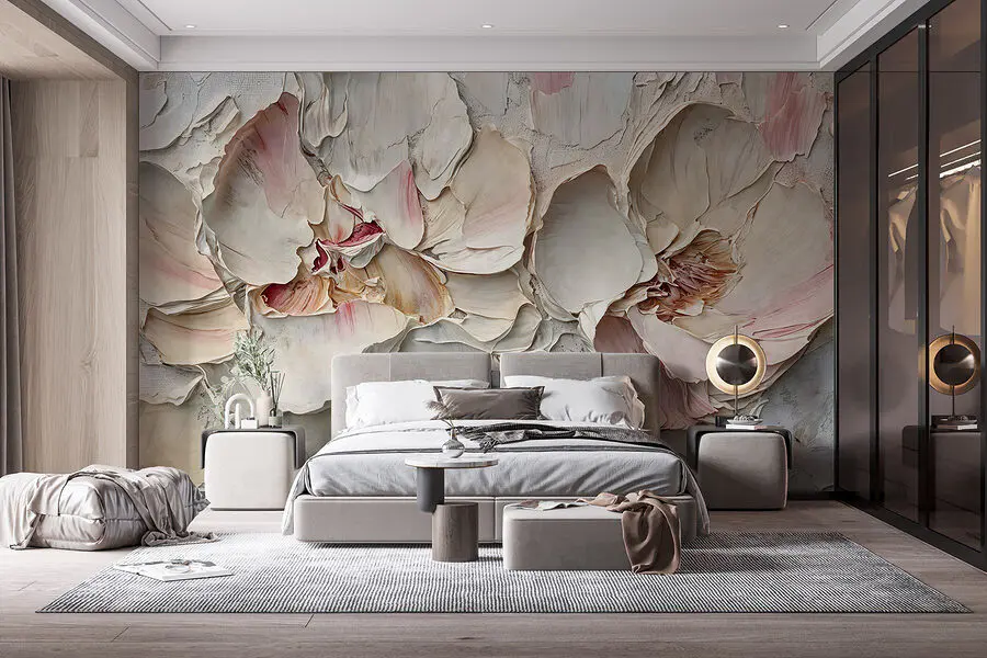 Transformeer je ruimte met de Fotobehang Delicate Blooms of Textured Petals. Stel je voor dat je een serene tuin binnenstapt telkens als je de kamer binnenkomt. Deze zachte, prachtig gelaagde bloemblaadjes voegen een vleugje natuur toe zonder de niesbuien die bij echte bloemen horen. Deze muurschildering is perfect om een knus hoekje te creëren en fluistert rust en charme in. Het is alsof je een kunstwerk hebt dat ademt en wiegt en je uitnodigt om het aan te raken, hoewel dat niet echt aan te raden is. Perfect om bij weg te dromen of thee te drinken terwijl je omringd bent door elegantie. Het is bloemig, aards en moeiteloos heerlijk. Wat heeft iemand nog meer nodig?