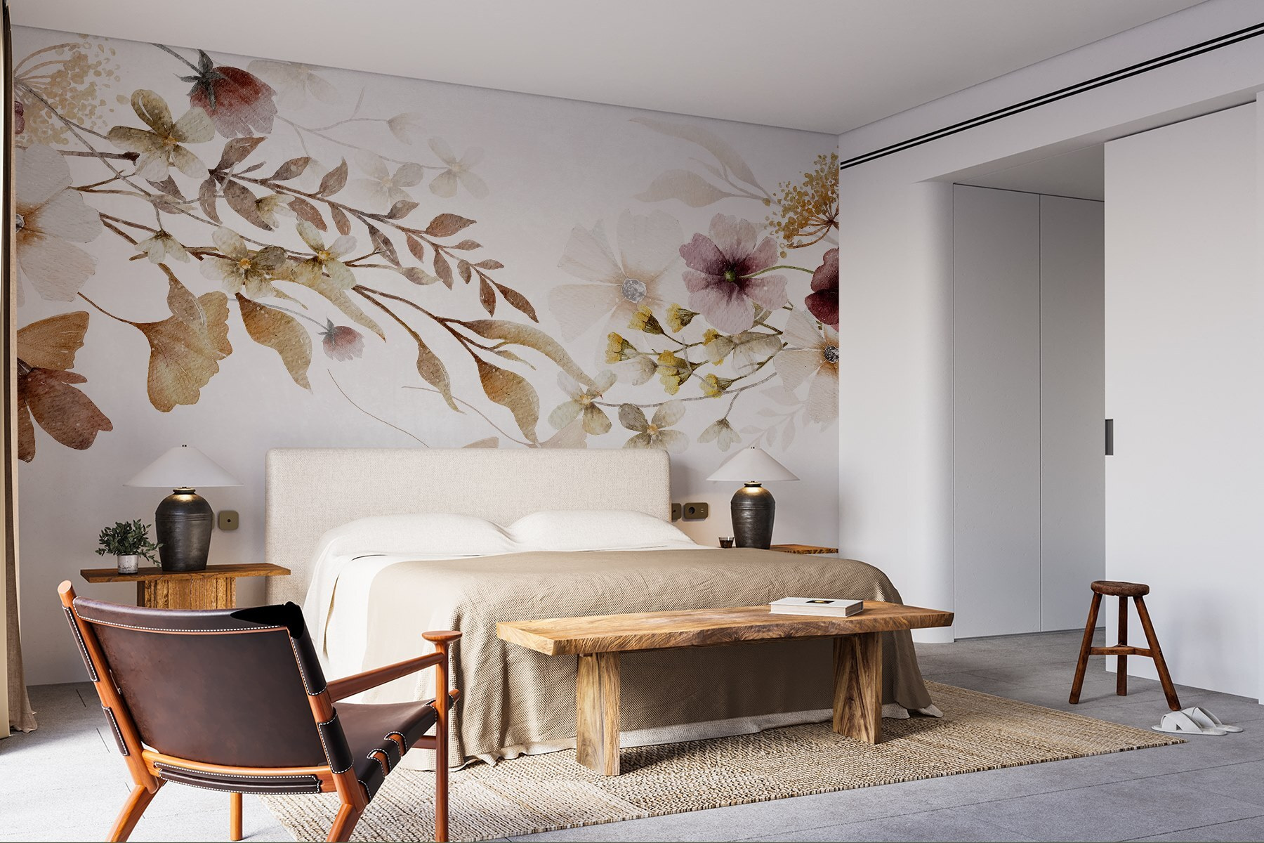 Transformeer je kamer met deze prachtige muurschildering die danst met delicate bloemen en bladeren, allemaal in zachte, dromerige waterverf. Stel je voor dat je elke dag wakker wordt met een zachte herinnering aan de schoonheid van de natuur in je kamer. Het is alsof je een tuin in huis haalt, zonder vervelende insecten!
