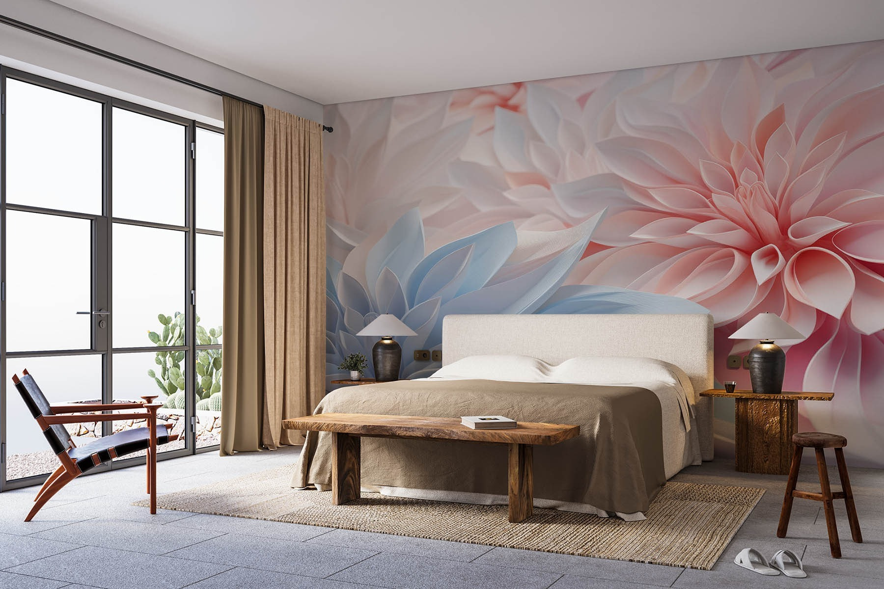 Transformeer je ruimte met deze prachtige muurschildering met een prachtig arrangement van pastelkleurige papieren bloemen. Stel je de frisse lucht eens voor – elke bloem in zacht roze en blauw voelt als een zachte omhelzing van de lente. Perfect voor een knus hoekje of een levendige woonkamer, het is alsof je een tuin in huis haalt zonder dat je water hoeft te geven.