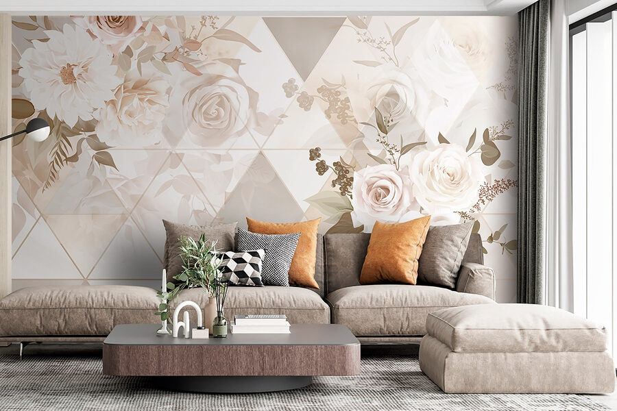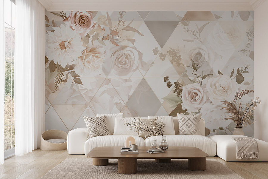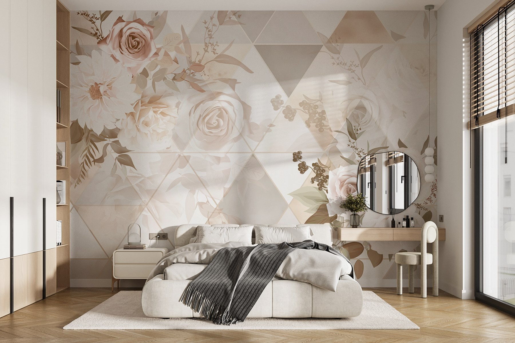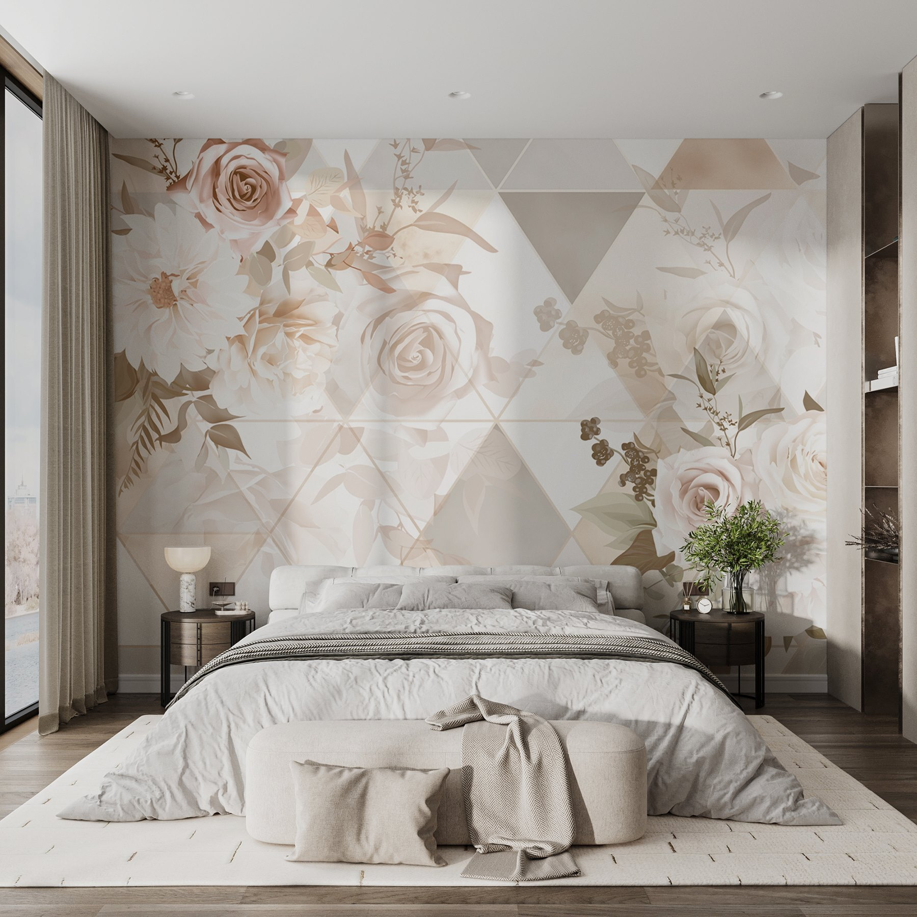 Tover elke kamer om in een serene oase met deze prachtige muurschildering met sierlijke bloemen en chique driehoeken. Het is alsof je een tuin binnenshuis haalt, maar dan zonder het gedoe van water geven! Stel je voor dat je ‘s ochtends aan je koffie nipt terwijl je je koestert in de zachte kleuren van pioenrozen en rozen. Deze muurschildering heeft een perfecte balans tussen elegantie en moderne flair, waardoor het een opvallend element is voor woonkamers of gezellige hoekjes. Het is als een zachte knuffel voor je muren. Ga je gang, laat je ruimte bloeien! Wie wil er nu niet een vleugje natuurschoon in huis?