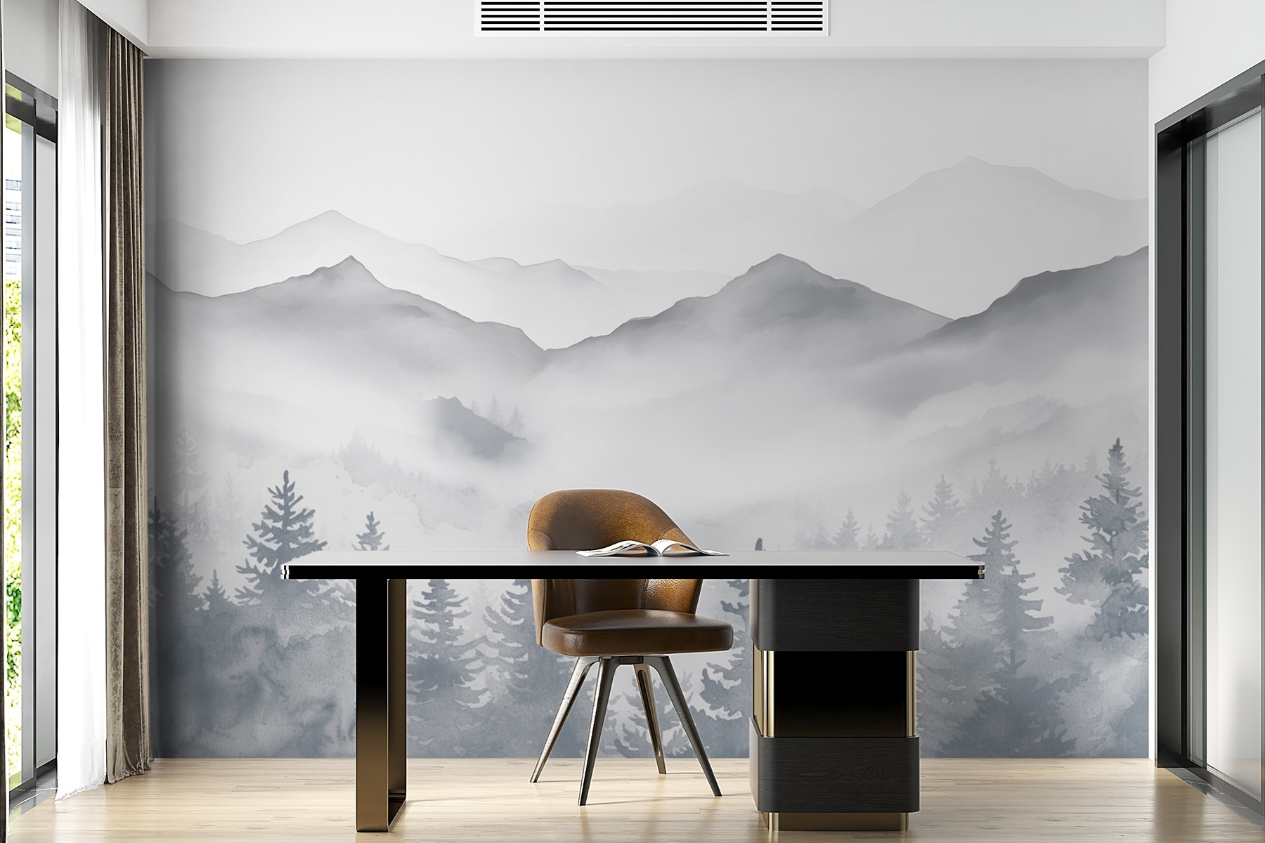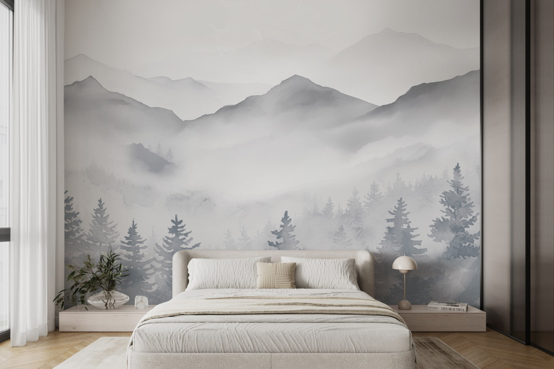 Tover elke ruimte om in een sereen toevluchtsoord met deze prachtige muurschildering van bergen en bomen. Het is alsof je een stukje natuur in huis haalt – perfect voor iedereen die van een mooi uitzicht houdt zonder te moeten wandelen. Stel je voor dat je koffie drinkt terwijl je naar de mistige toppen en torenhoge bomen staart, die je doen denken aan die onvergetelijke retraites in de bergen. De zachte aquarelstijl voegt een zachte elegantie toe en verzacht de sfeer in elke kamer. Het voelt knus en inspirerend, als een warme knuffel van de natuur. Het is niet alleen decor; het is elke dag een moment van rust. Wie heeft dat niet nodig?