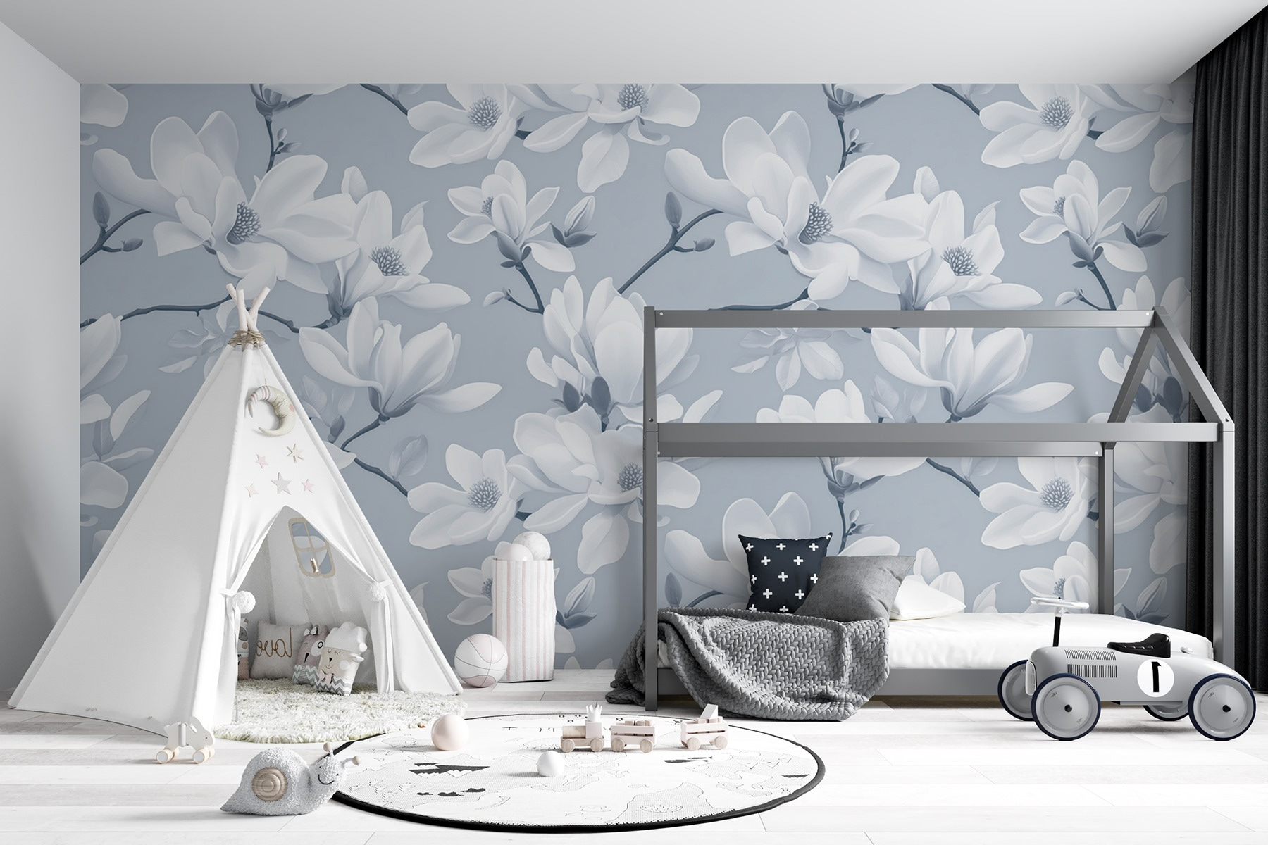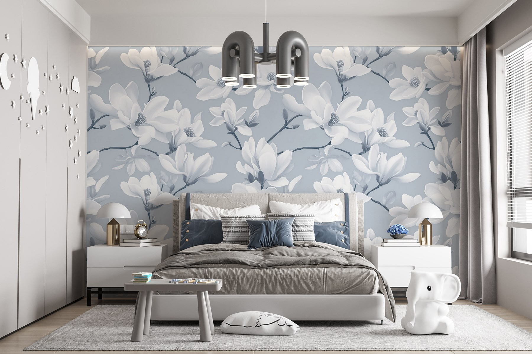 Transformeer uw ruimte met deze dromerige muurschildering met een prachtig patroon van witte bloemen. Het is alsof u een lentetuin in huis haalt – iedereen die de kamer binnenkomt, voelt zich alsof hij of zij een serene oase is binnengestapt. De zachte aquarelstijl voegt een vleugje eigenzinnigheid toe, waardoor het perfect is voor gezellige hoekjes of chique woonruimtes. Stel je voor dat je ‘s ochtends van je koffie nipt, omringd door deze bloemen – dat is zeker beter dan naar saaie muren staren! Bovendien zorgt het zachte kleurenpalet voor een rustgevende sfeer, waardoor elke dag een beetje specialer aanvoelt. Laat je huis tot leven komen met de natuur – je hoeft geen groene vingers te hebben!