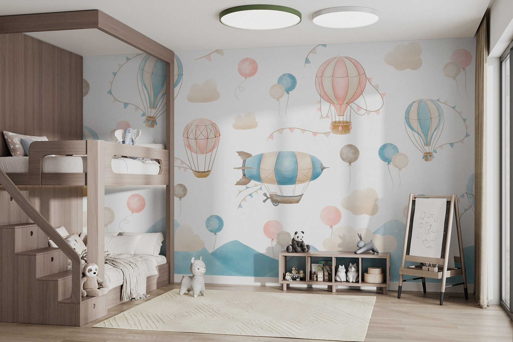 Imagine stepping into a dreamy world where hot air balloons float gently above soft clouds—sounds cozy, right? This “Group of Hot Air Balloons and Flags” mural brings that magic right into your space. The watercolor vibes are effortlessly charming, whispering stories of adventure and carefree days. Picture a kid’s room that feels like a sky-high wonderland or a living room that sparks joy with a unique twist. Those pastel colors? A lovely, soothing touch! It’s like a gentle hug every time you glance at it. And hey, who couldn’t use a little more whimsy in their life? Perfect for inspiring daydreams and conversations, this mural truly elevates any wall. Enjoy the journey, one balloon at a time!