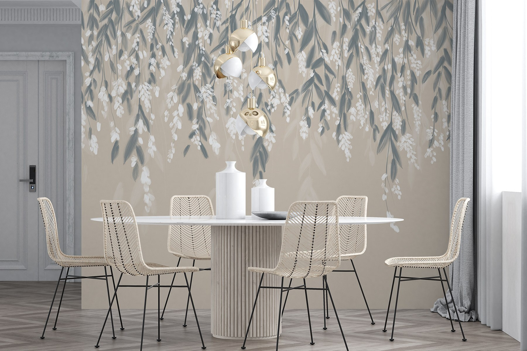Transform any space into a breezy garden retreat with the “Delicate Blooms on Soft Backdrop” mural. Imagine stepping into a room that feels like it’s kissed by nature—where soft greens and whispery whites dangle from above. It’s perfect for daydreaming or reading that book you’ve been meaning to pick up.
