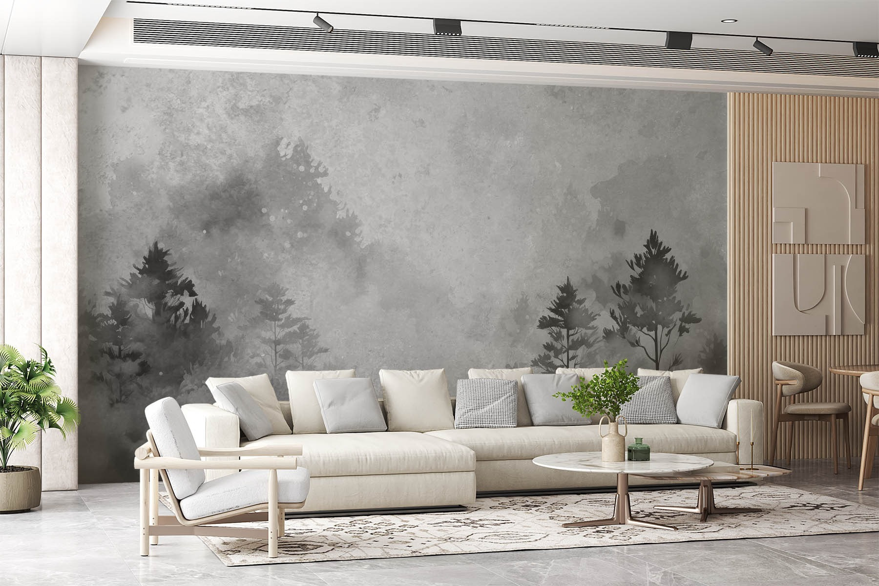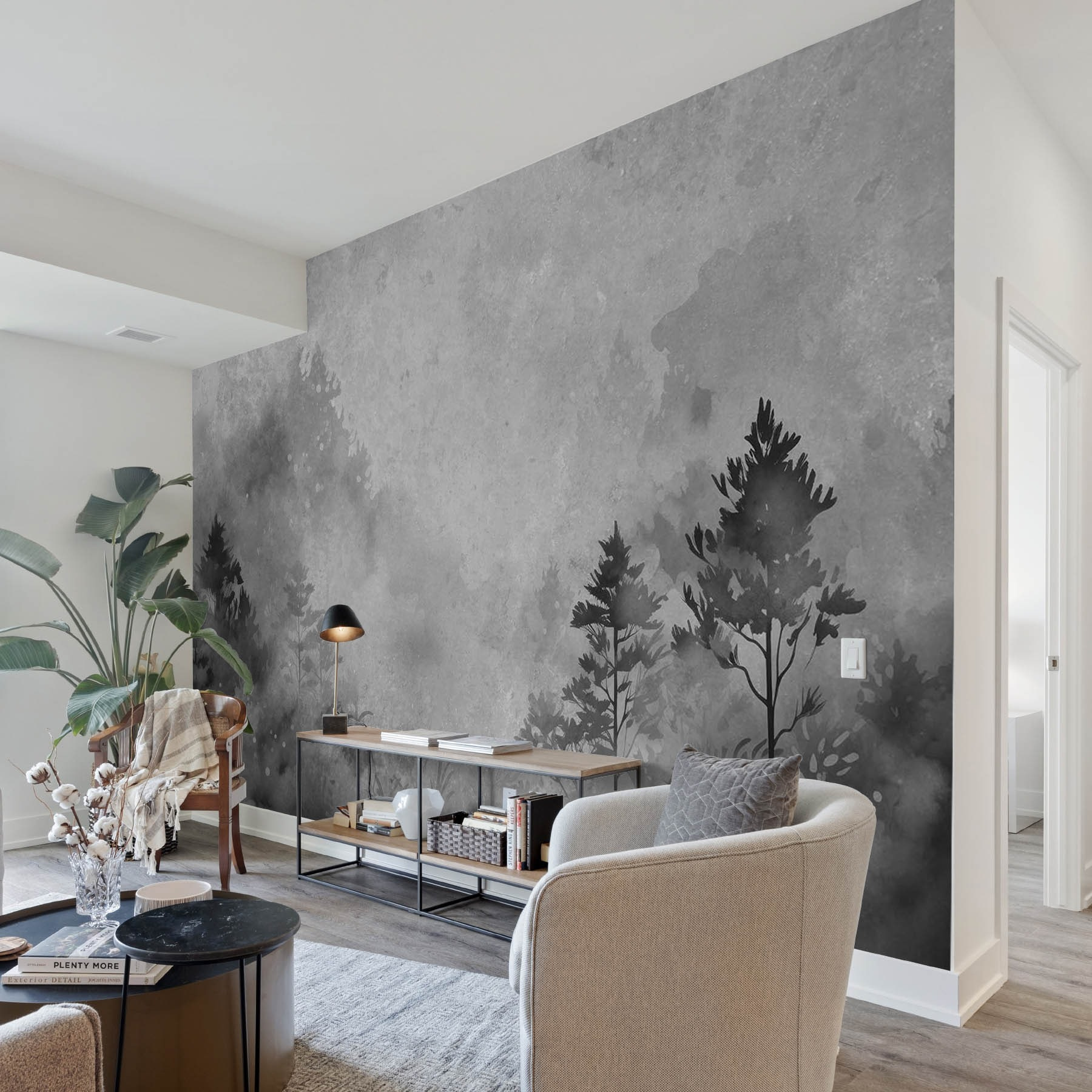 Verander elke kamer in een rustgevend toevluchtsoord met deze fascinerende zwart-wit muurschildering met bomen en struiken. Stel je voor dat je ‘s ochtends aan je koffie nipt, omringd door een zacht boslandschap dat aanvoelt alsof de natuur zichzelf heeft uitgenodigd om binnen te komen. Het geeft een unieke draai aan de moderne inrichting, nodigt uit tot sereniteit en voelt toch artistiek aan. De reacties van vrienden voor je zien? Onbetaalbaar. Ze zullen betoverd zijn, misschien zelfs een beetje jaloers. Bovendien is het gemakkelijk te combineren met verschillende stijlen, of je nu houdt van minimalisme, rustieke sferen of zelfs een vleugje eigenzinnigheid. Perfect om die extra flair toe te voegen zonder de ruimte te overweldigen!