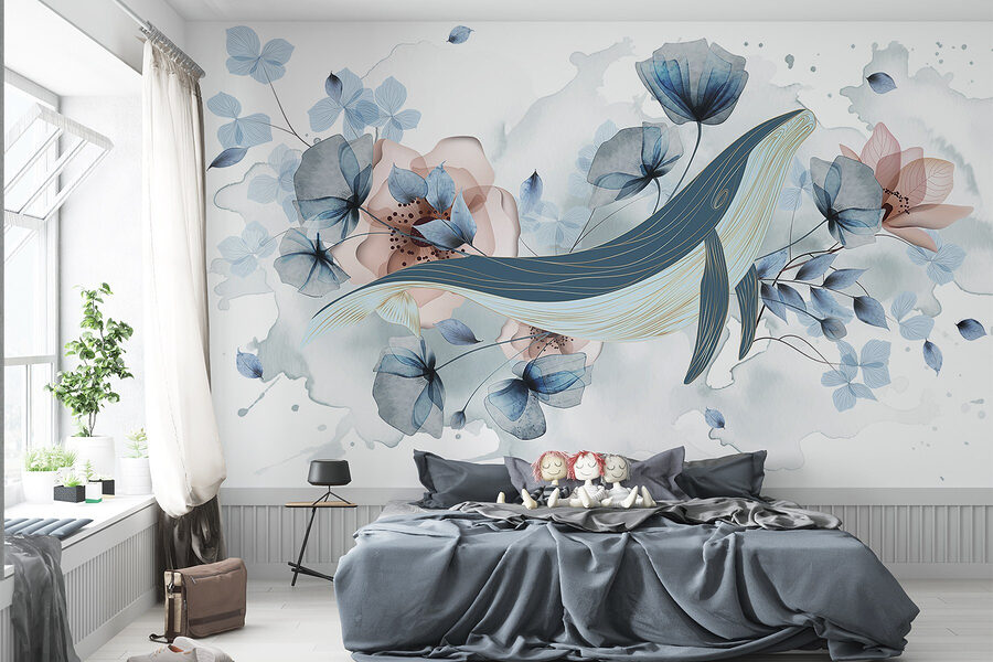 Transformeer je ruimte met deze betoverende muurschildering van een walvis die tussen delicate bloemen en bladeren zwemt. Het brengt een zacht vleugje oceaan in je huis. Stel je een dromerige middag voor, loungend in je knusse hoekje, terwijl de zachte pastelkleuren en vloeiende lijnen je meevoeren naar de sereniteit van de zee. Het is alsof de oceaan je geheimen van avontuur influistert, omlijst door de schoonheid van de natuur. Perfect voor een kinderkamer, een rustgevende kantoorruimte of waar dan ook waar je een vleugje eigenzinnigheid kunt gebruiken. Plus, het is een kleine herinnering dat zelfs de grootste wezens kunnen genieten van een bloemrijke dagdroom. Duik in een wereld waar kunst en rust elkaar ontmoeten!