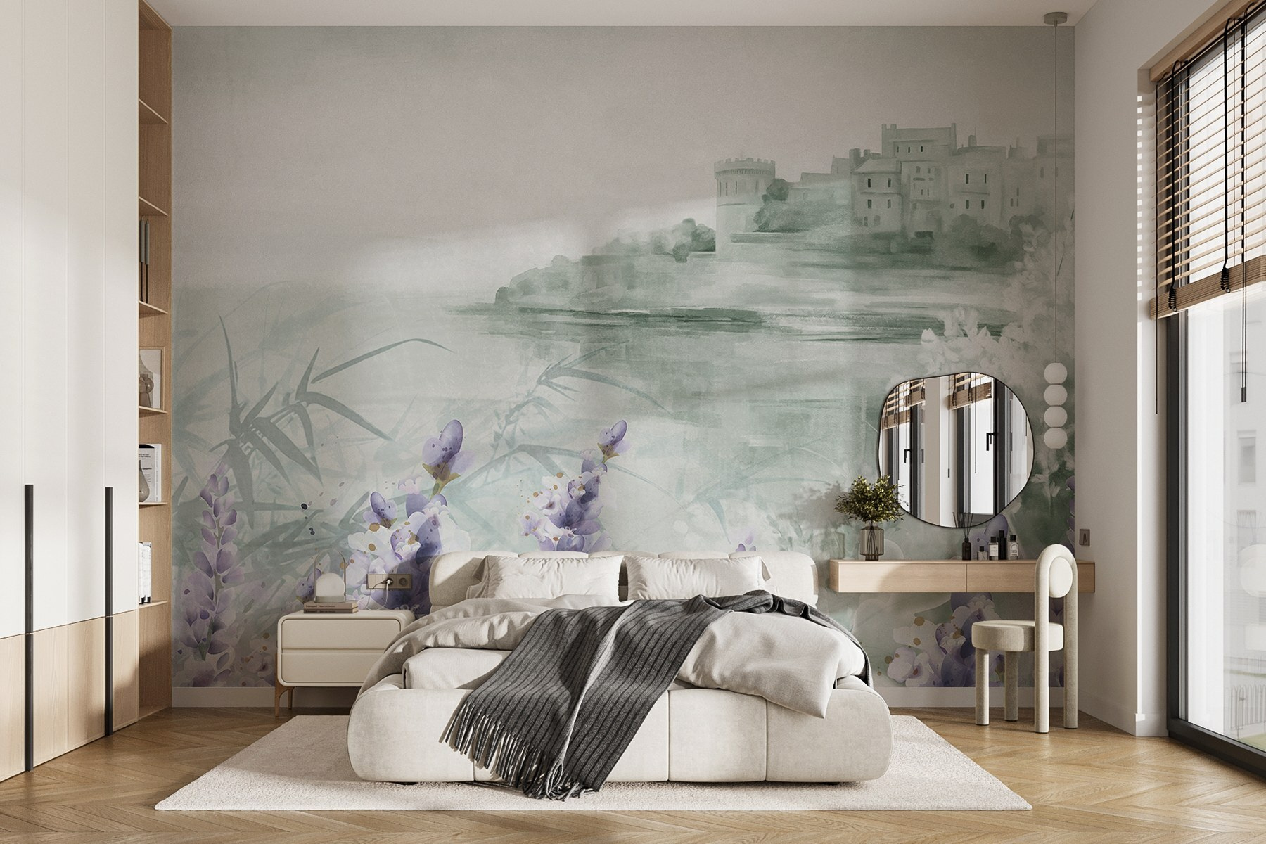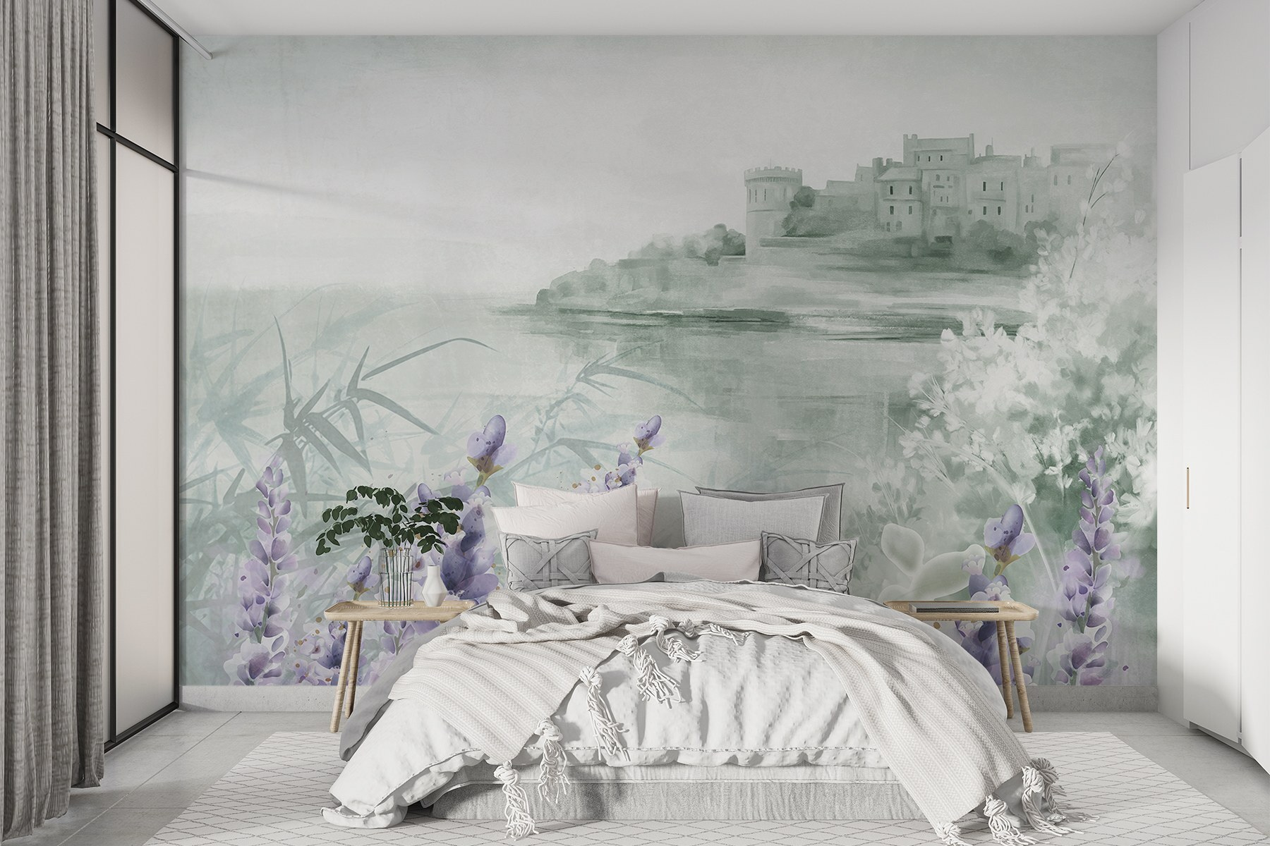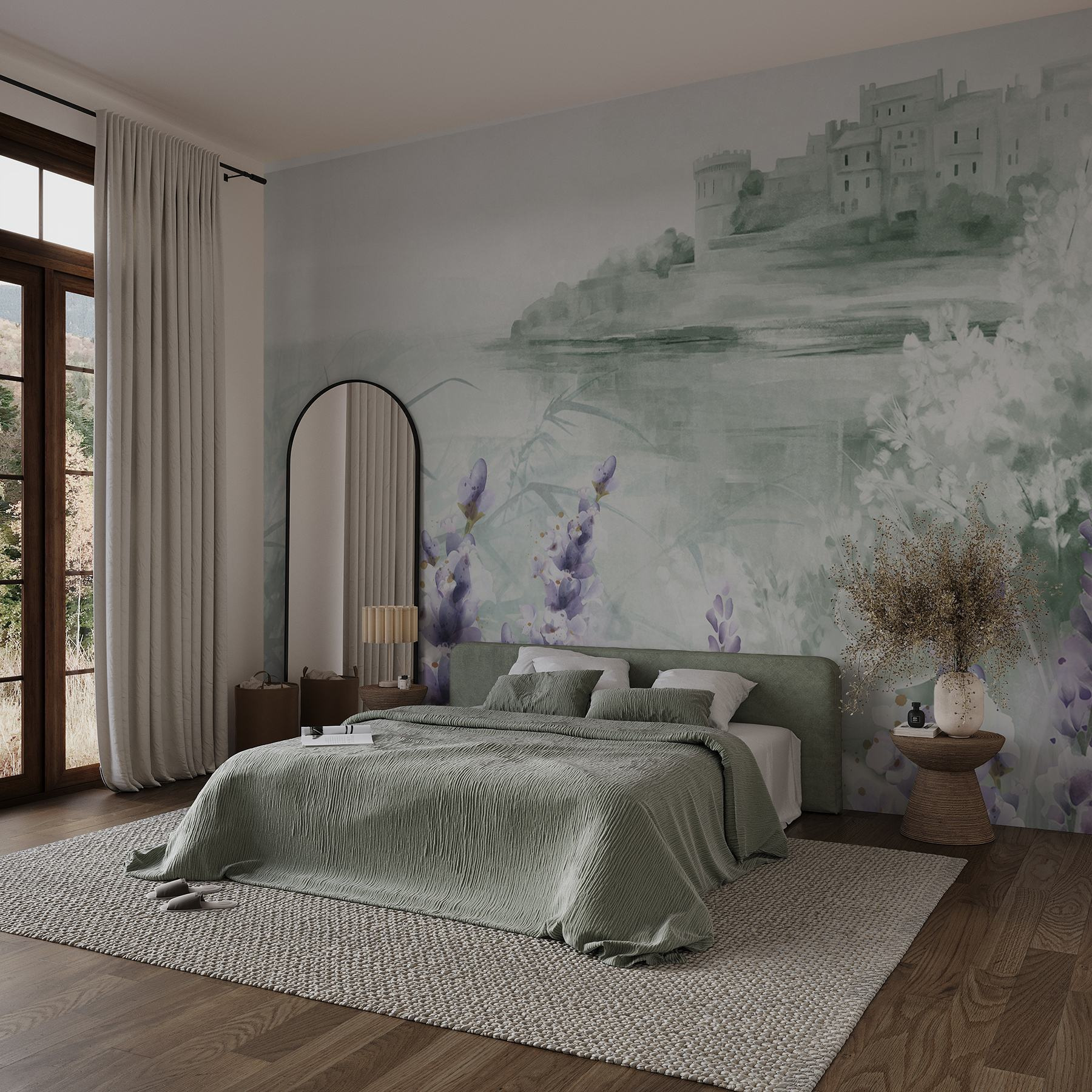 Transformeer elke ruimte met deze dromerige aquarelmuurschildering met een charmant kasteel en delicate bloemen. Stel je voor dat je een kamer binnenloopt die aanvoelt als een serene ontsnapping, waar zachte lavendeltinten en zachte groentinten samenkomen om een kalme sfeer te creëren. Het is alsof de muren poëzie fluisteren en uitnodigen tot dagdromen over avonturen in een betoverende tuin. Of het nu gaat om het opfleuren van een gezellige leeshoek of het toevoegen van een vleugje eigenzinnigheid aan een familiekamer, deze muurschildering brengt een vleugje natuurlijke schoonheid binnenshuis. Het is kunst die levendig aanvoelt, vreugde en creativiteit opwekt en je doet glimlachen telkens als je er langs loopt. Wie wist dat decoratie kon aanvoelen als een frisse wind?