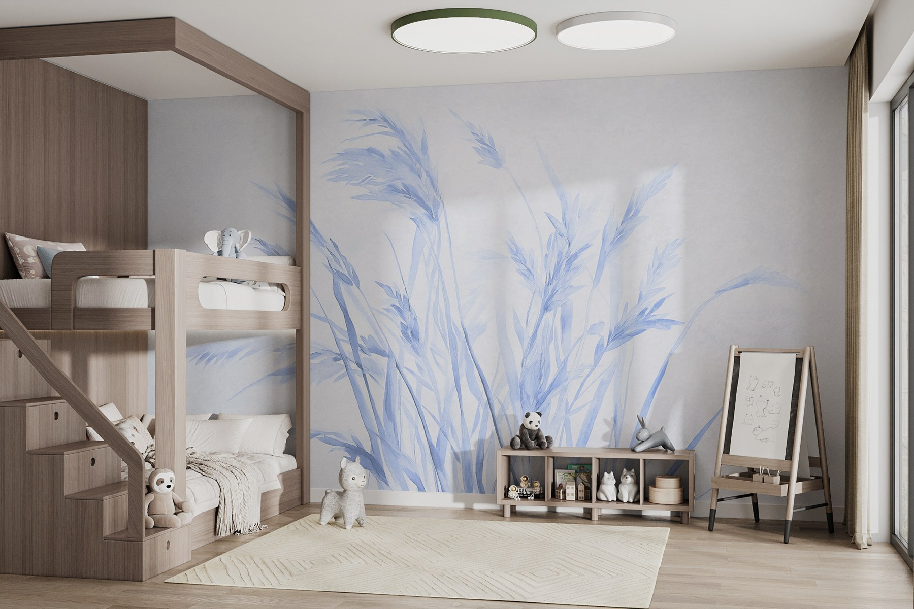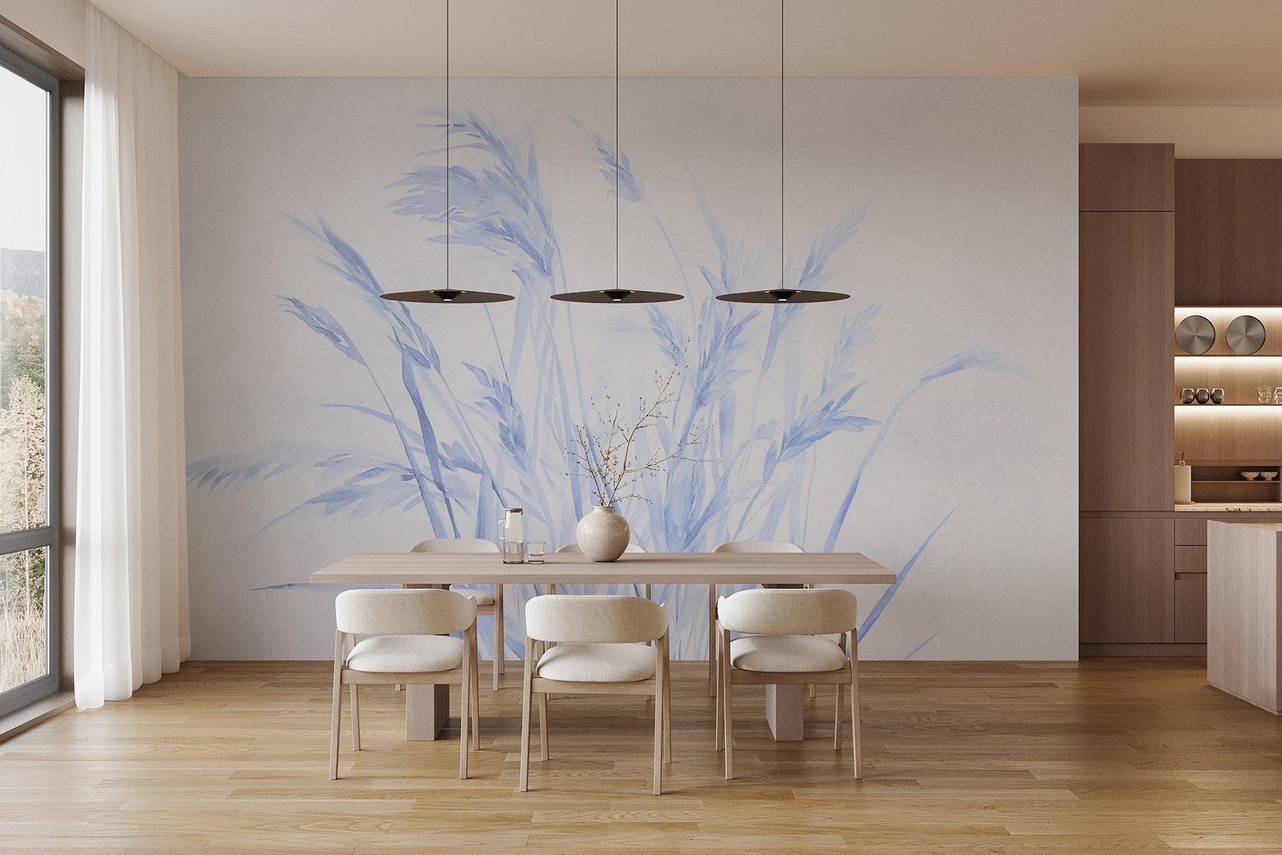 Stel je voor dat je in een serene wereld stapt waar een zacht briesje door zachte grassprieten fluistert – deze muurschildering brengt dat dromerige tafereel rechtstreeks naar je muur. De koele blauwe tinten creëren een kalme sfeer, waardoor elke ruimte vrediger aanvoelt. Stel je voor dat je tot rust komt na een lange dag, genietend van de rustgevende beelden, alsof je ligt te loungen in een grasweide, alleen jij en je favoriete boek. Perfect voor woonkamers of gezellige leeshoekjes. Deze muurschildering kleedt niet alleen de muren aan, maar brengt leven in je huis en nodigt uit tot warmte en ontspanning.
