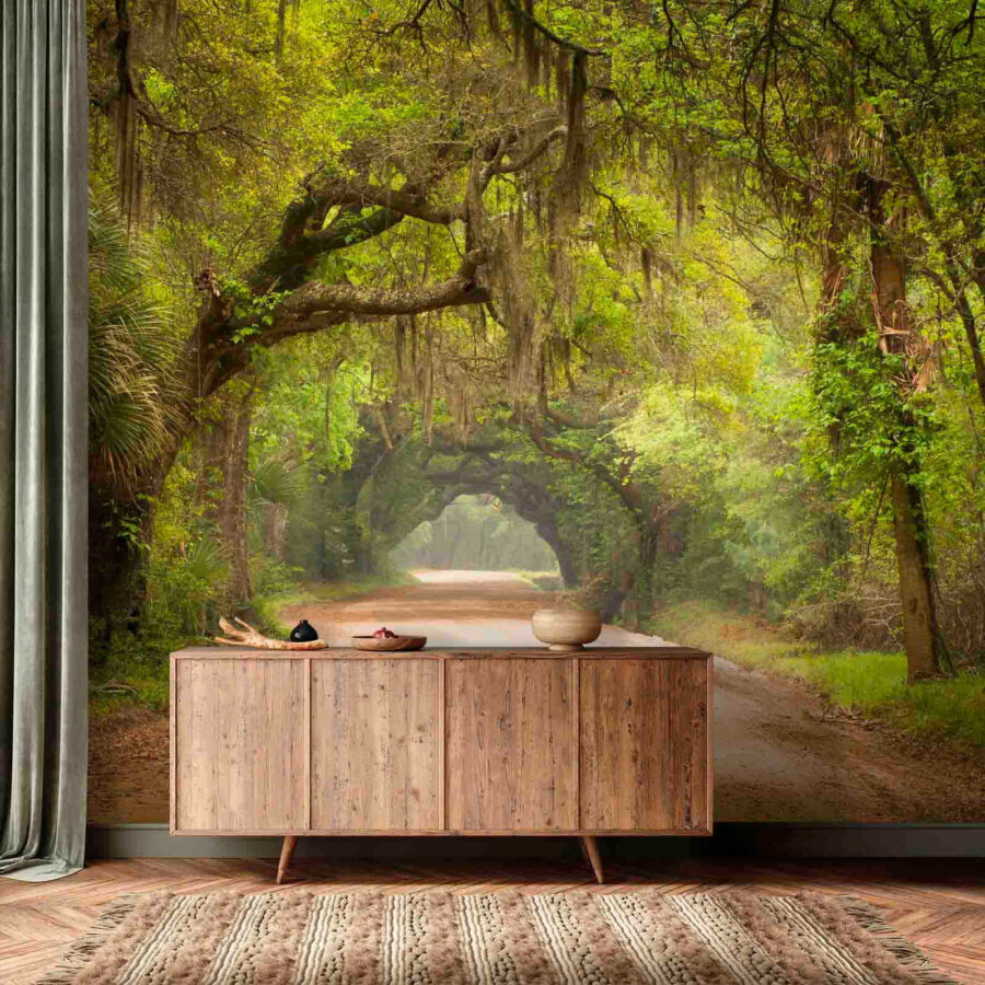 Stel je voor dat je op een zonnige dag een onverharde weg betreedt, waar bomen boven je hoofd dansen, gehuld in een zachte, groene sluier van mos. Deze muurschildering is niet alleen een wanddecoratie, het is een toevluchtsoord, een stukje natuur in je woonkamer. Het nodigt uit tot dagdromen over een wandeling over dat pad, waarbij je misschien een nieuwsgierig hert tegenkomt of gewoon een zacht briesje voelt. Perfect voor mensen die van het buitenleven houden, maar hun gezellige binnenhuis niet willen opgeven. Voeg een vleugje warmte en een hint van avontuur toe aan elke ruimte, en zo voelt elke blik als een minivakantie. Wie wil er nu geen eerste rang voor zo’n vredig uitzicht?