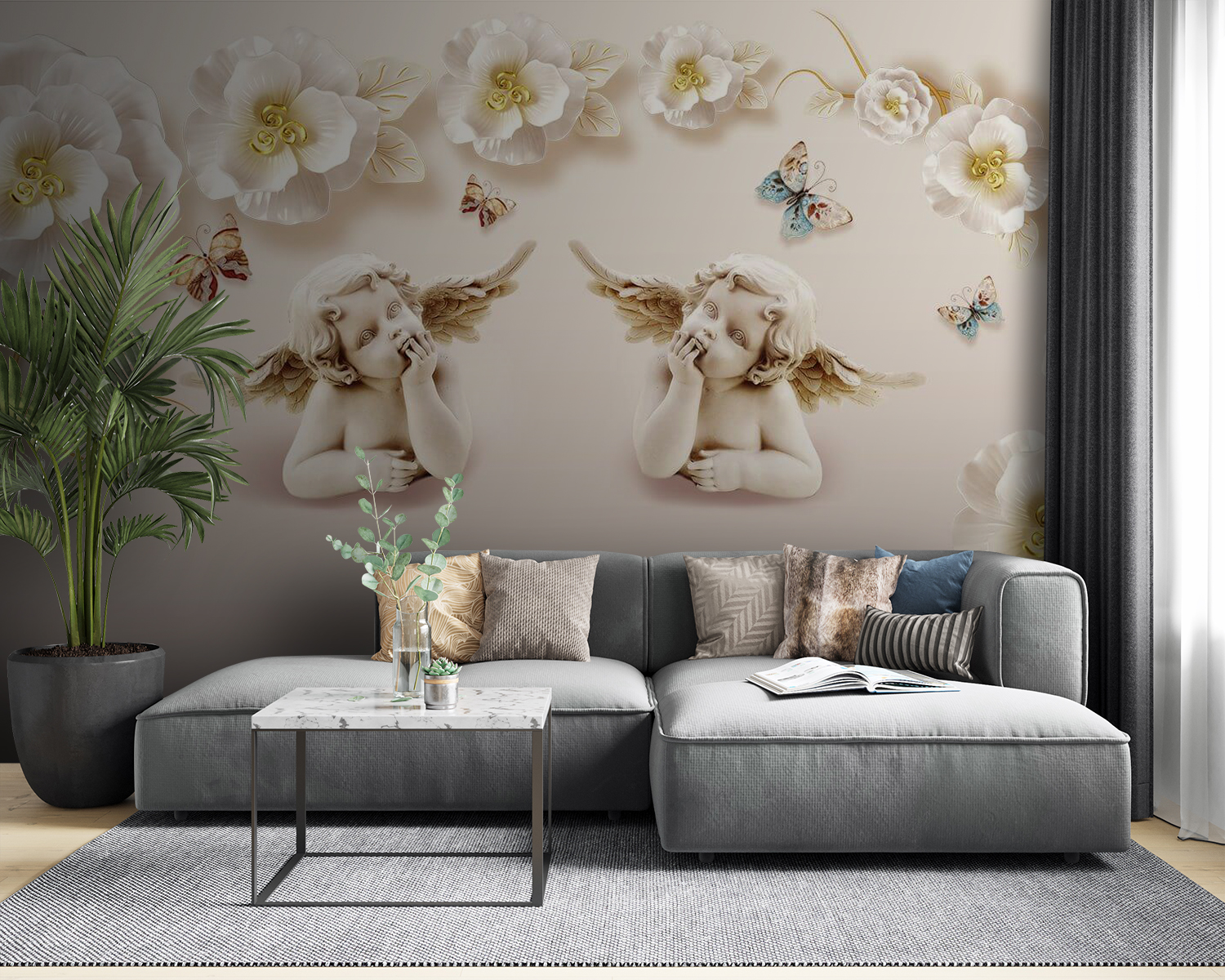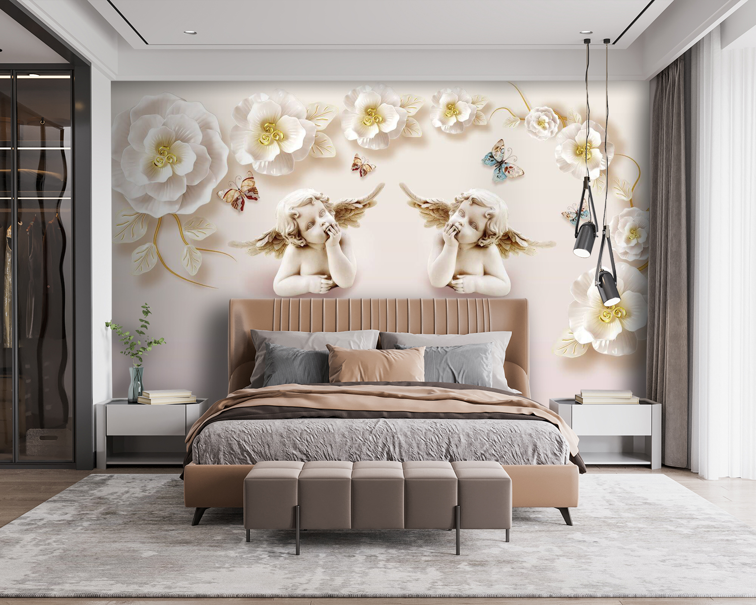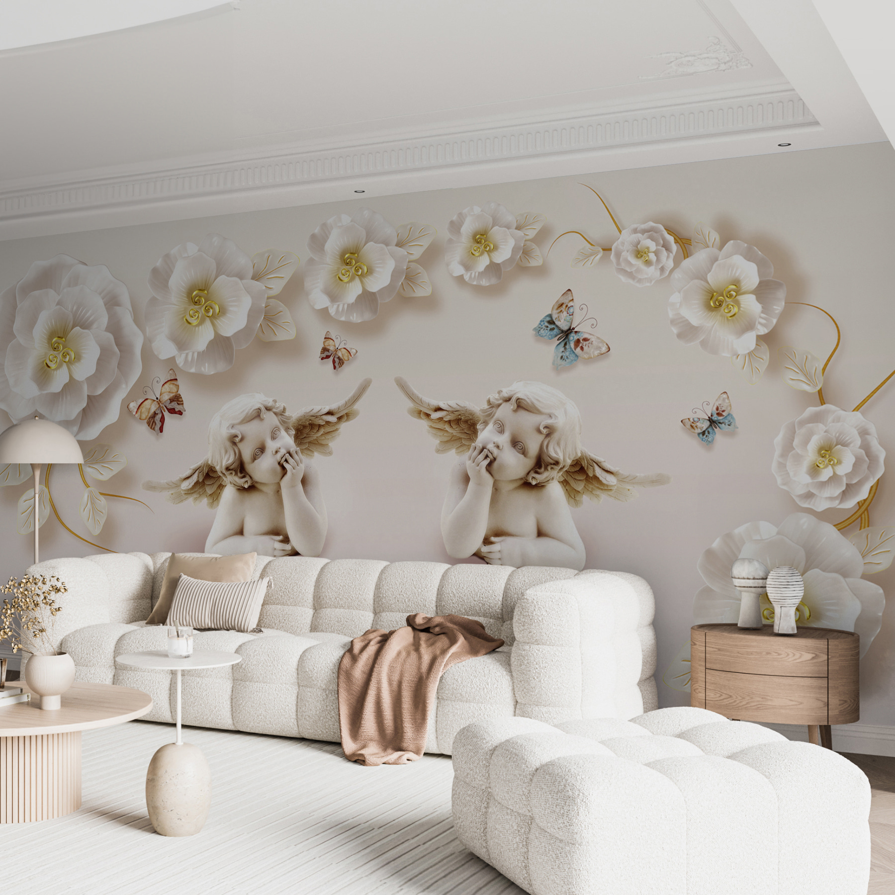 Stel je dit eens voor aan je muur – een paar schattige engeltjes met vleugels, omringd door dromerige, te grote bloemen en zachtjes fladderende vlinders. Het is alsof je een sprookjestuin binnenstapt telkens als je de kamer binnenkomt. Deze muurschildering is niet alleen decoratie, het is een hele sfeer. Stel je voor dat je na een lange dag thuiskomt en dit serene tafereel verwelkomt je en geeft je meteen een goed humeur. Ideaal voor iedereen die houdt van een vleugje eigenzinnigheid met een vleugje elegantie. Bovendien is het een fantastische gespreksstarter, gasten zullen je artistieke smaak zeker waarderen. Dit is waar architectuur en sprookjesachtige charme elkaar ontmoeten – perfect voor diegenen die hunkeren naar een beetje betovering in hun dagelijks leven.