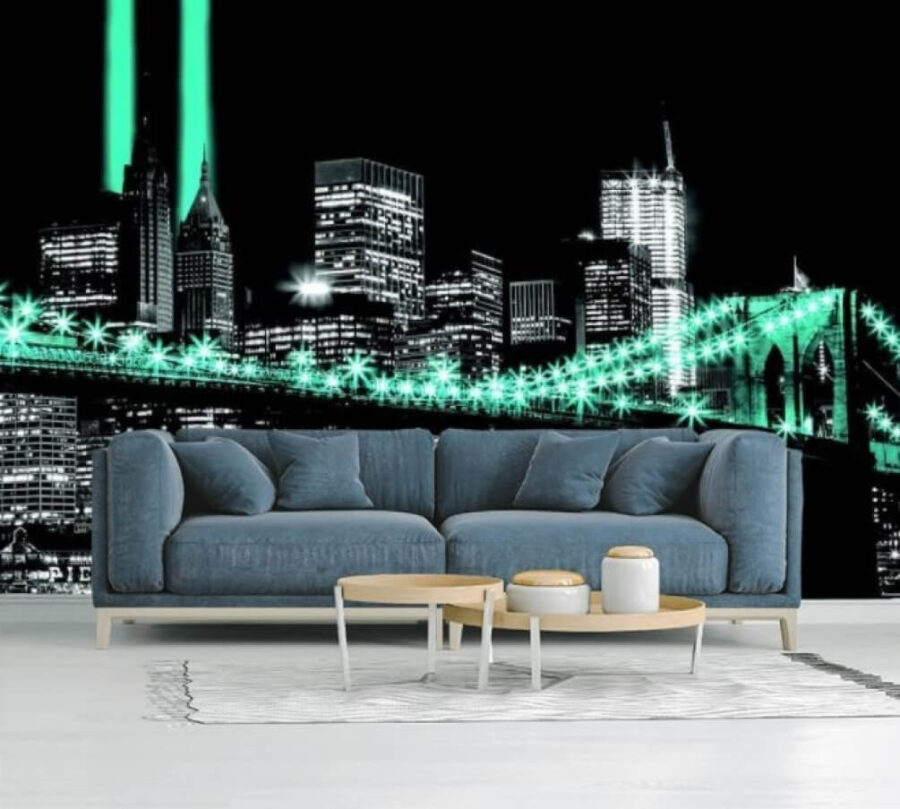 Verander elke muur in een betoverend tafereel met deze prachtige muurschildering van een brug badend in licht, perfect voor liefhebbers van de sfeer van de stad. Stel je voor dat je een kamer binnenloopt en wordt begroet door dit opwindende uitzicht – het is alsof je een stukje stedelijke magie in huis haalt. De rijke contrasten van zwart en groen roepen een gezellige maar levendige sfeer op, waardoor het een perfecte achtergrond is voor filmavonden of late nachtelijke gesprekken. Deze muurschildering geeft je misschien wel het gevoel dat je midden in het hart van een stad bent beland die nooit slaapt. Wie heeft er nog reizen nodig als je muur je mee kan nemen?
