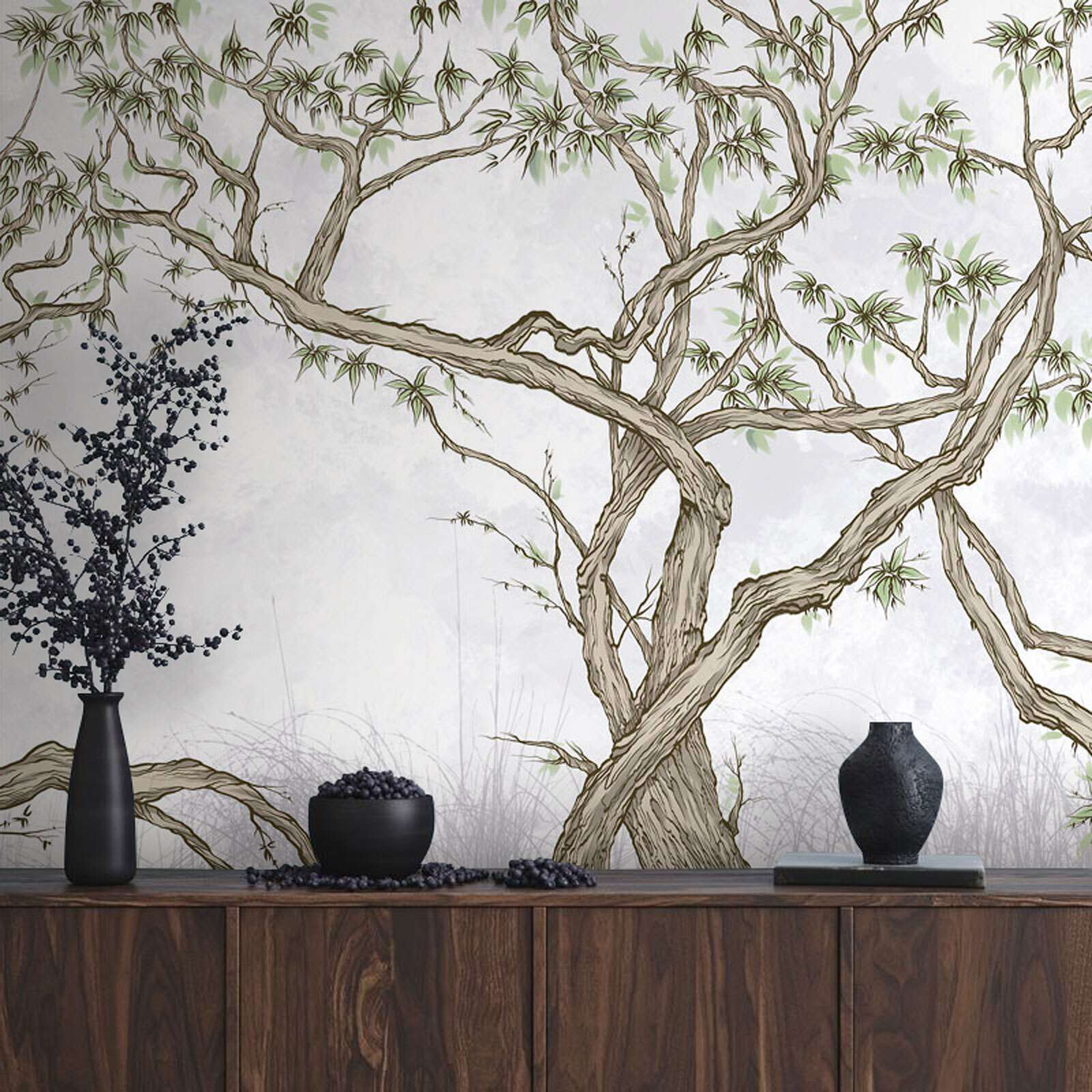 Transformeer elke ruimte met deze prachtige muurschildering genaamd “Tree with Many Branches” (Boom met vele takken). Het is perfect voor wie verlangt naar een vleugje natuur binnenshuis. Stel je voor: een prachtig gedetailleerde boom die zich uitstrekt over de muur, met takken die dansen tegen een zachte achtergrond. Misschien vind je jezelf wel terug in een dagdroom onder de schaduw van de boom, of plan je zelfs een gezellig leeshoekje in de buurt.