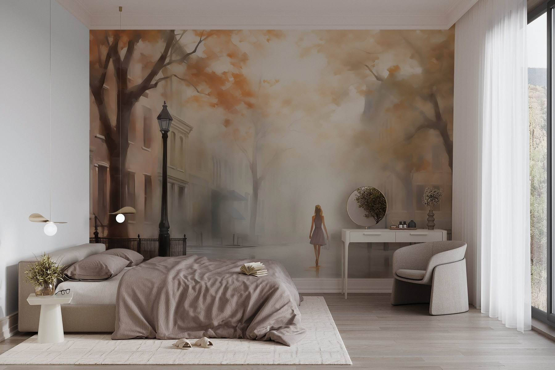 Stel je voor: een vrouw die door een mistige straat wandelt, gehuld in de warme tinten van de herfst. Deze muurschildering is niet zomaar kunst; het is een deur naar een dromerige ontsnapping. Stel je voor dat het je woonkamer of gezellige slaapkamer opfleurt en iedereen aantrekt die er een glimp van opvangt. De mist creëert een gevoel van mysterie, waardoor elke blik als een avontuur voelt. En die nostalgische sfeer? Perfect voor avonden waarin je herinneringen ophaalt of je volgende ontsnapping plant. Het is alsof je een sereen stukje stadsleven in huis haalt, één dromerige stap tegelijk – wat een sfeer!