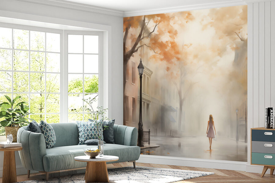 Stel je voor: een vrouw die door een mistige straat wandelt, gehuld in de warme tinten van de herfst. Deze muurschildering is niet zomaar kunst; het is een deur naar een dromerige ontsnapping. Stel je voor dat het je woonkamer of gezellige slaapkamer opfleurt en iedereen aantrekt die er een glimp van opvangt. De mist creëert een gevoel van mysterie, waardoor elke blik als een avontuur voelt. En die nostalgische sfeer? Perfect voor avonden waarin je herinneringen ophaalt of je volgende ontsnapping plant. Het is alsof je een sereen stukje stadsleven in huis haalt, één dromerige stap tegelijk – wat een sfeer!