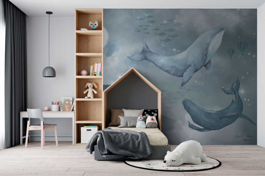 Stel je voor dat je de kamer van je kind in een onderwaterlandschap verandert – met deze muurschildering “Walvissen zwemmen in het water” is dat precies wat je nodig hebt! Met zijn dromerige, zachte blauwtinten en speelse walvissen die ronddansen, is het niet zomaar een muurschildering; het is alsof je in een sprookjesboekavontuur duikt. De muurschildering is perfect voor baby- en kinderkamers en geeft een vredige sfeer en een gevoel van magie. Het is een van die stukken die je doen glimlachen elke keer als je binnenkomt, en wie weet inspireert het zelfs een toekomstige zeebioloog of twee. Lichtgewicht, elegant en heel charmant – plus, houdt niet elk kind van walvissen?