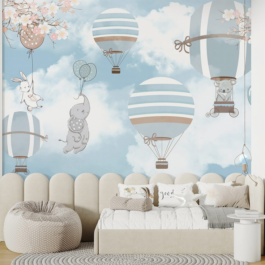 Heb je een kinderkamer die wel wat eigenzinnigheid kan gebruiken? Kijk dan eens naar deze prachtige muurschildering met een stel schattige olifanten die in heteluchtballonnen vliegen. Stel je voor: zachte blauw- en grijstinten, een parade van speelse olifanten en een grillige hemel die aanvoelt als een droom. Perfect om eindeloze verwondering en avontuur op te wekken in de ruimte van een kleintje. Stel je de ogen van je zoon voor die oplichten als hij in slaap valt onder vrolijke olifanten en charmante ballonnen. Deze muurschildering is niet alleen decor – het is een poort naar verbeelding. Vul de kamer van je kind met vreugde en laat het avontuur de vrije loop!