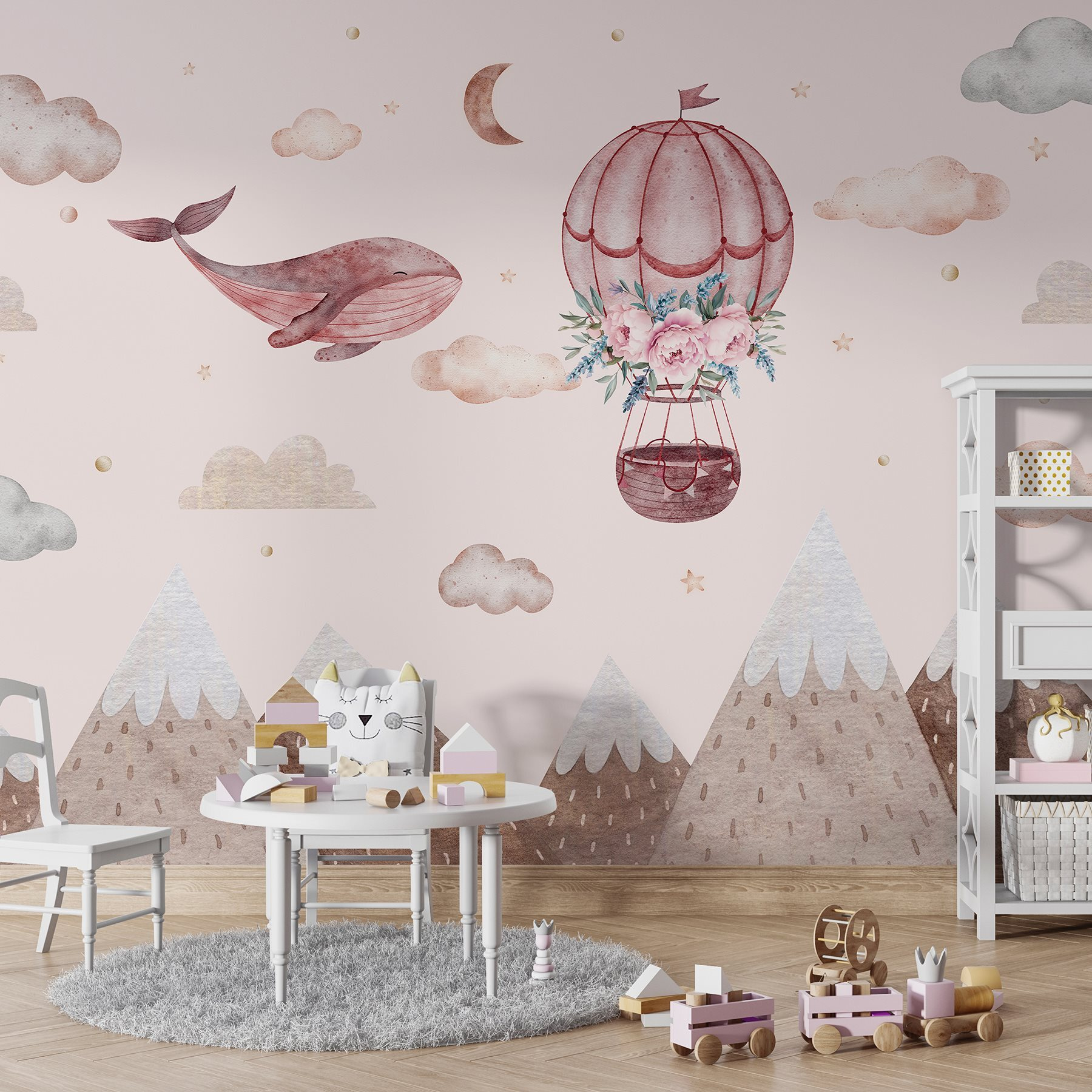 Stel je een grillige wereld voor waarin walvissen door de lucht zweven – ja, dat gebeurt hier met deze muurschildering! Met een charmante heteluchtballon versierd met delicate bloemen is het een verrukkelijk tafereel dat tot de verbeelding spreekt. Stel je voor dat je een kinderkamer of een gezellig leeshoekje omtovert tot een dromerige ontsnapping. De zachte kleuren en zachte bergen creëren een serene sfeer, perfect om achterover te leunen met een goed boek of te dagdromen. Het is net een klein avontuur aan de muur – wie wil er nou niet met een vriendelijke walvis de wolken in zeilen? Hang het gewoon op en laat de magie zich ontvouwen!
