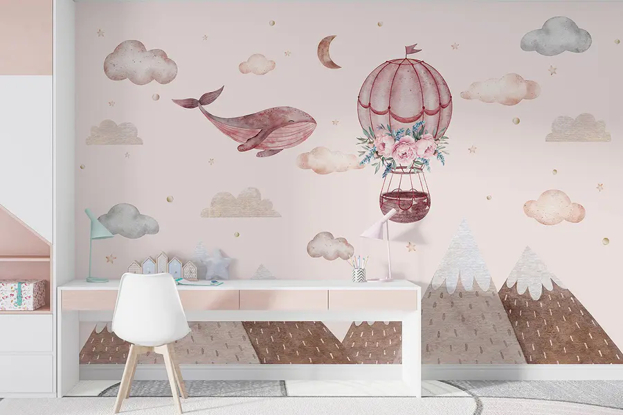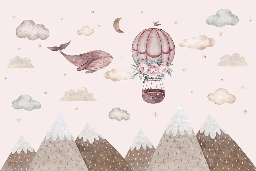 Stel je een grillige wereld voor waarin walvissen door de lucht zweven – ja, dat gebeurt hier met deze muurschildering! Met een charmante heteluchtballon versierd met delicate bloemen is het een verrukkelijk tafereel dat tot de verbeelding spreekt. Stel je voor dat je een kinderkamer of een gezellig leeshoekje omtovert tot een dromerige ontsnapping. De zachte kleuren en zachte bergen creëren een serene sfeer, perfect om achterover te leunen met een goed boek of te dagdromen. Het is net een klein avontuur aan de muur – wie wil er nou niet met een vriendelijke walvis de wolken in zeilen? Hang het gewoon op en laat de magie zich ontvouwen!