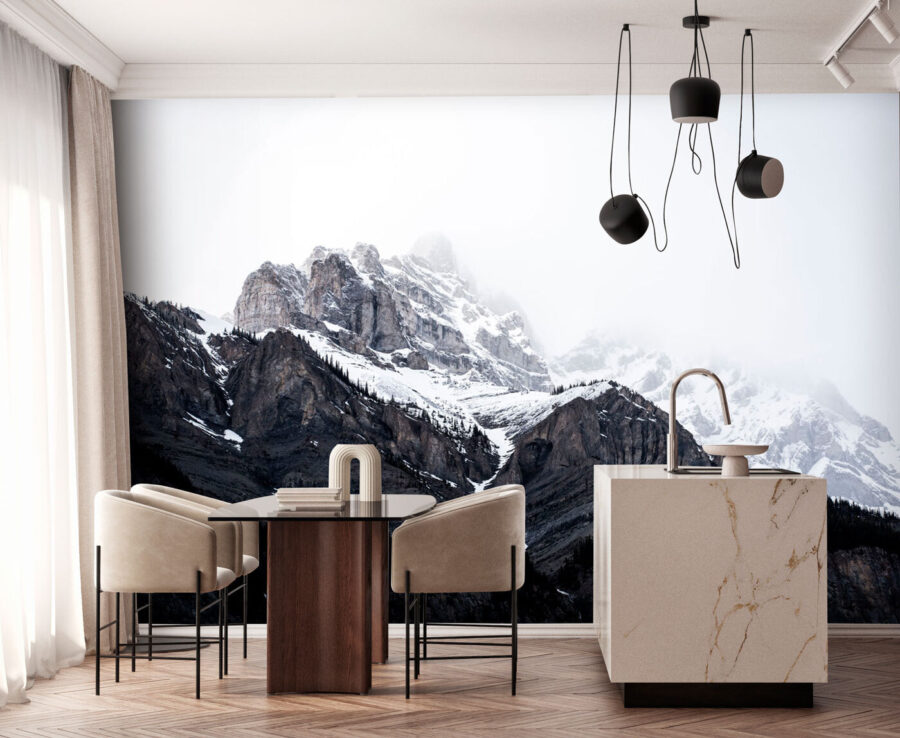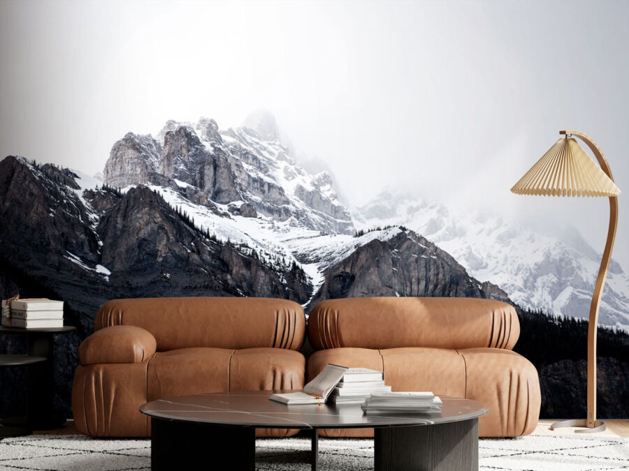 Hang deze muurschildering in je woon- of slaapkamer en plotseling voelt elke dag een beetje avontuurlijker. Je kunt de frisse bries bijna voelen en het zachte knisperen van sneeuw onder je laarzen horen. Plus, dat grimmige contrast van donkere, ruige rotsen tegen de witte sneeuw? Zo dramatisch en toch rustgevend.