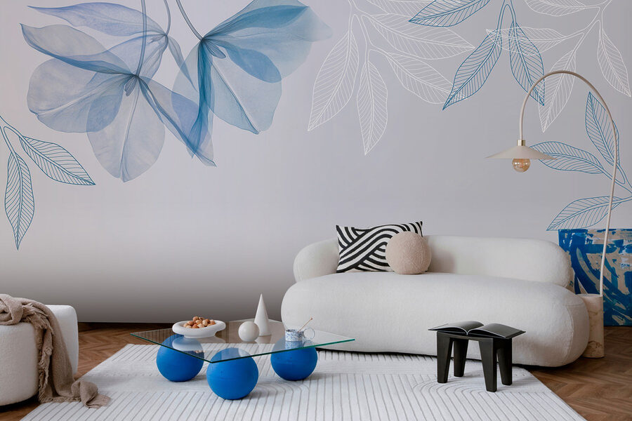 Verander een effen muur in een serene ontsnapping met deze muurschildering met blauwe en witte bladeren. Het is alsof je een zacht briesje binnen laat, dat geheimen van het buitenleven fluistert. Stel je een knus hoekje voor, een dampende kop thee en deze muurschildering die de perfecte sfeer neerzet – is dat niet dromerig?