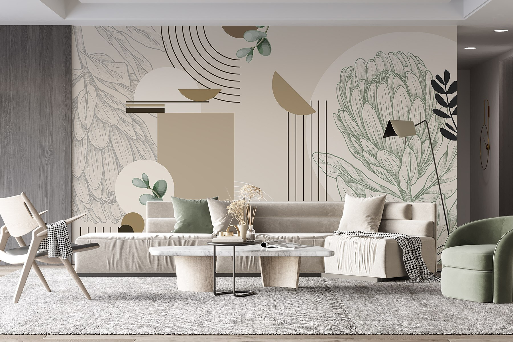 Transformeer je ruimte met deze prachtige muurschildering met delicate plant- en bladmotieven die comfort en elegantie uitstralen. Stel je eens voor dat je een kamer binnenloopt die aanvoelt als een sereen toevluchtsoord in de tuin – zacht groen en aardetinten zorgen voor een kalme sfeer, perfect om tot rust te komen na een lange dag. De speelse mix van vormen geeft er een moderne draai aan, waardoor het een geweldige gespreksstarter is. Vrienden zullen vragen hoe ze er een kunnen krijgen! Of het nu in een gezellig hoekje is of op een opvallende muur, deze muurschildering nodigt de natuur uit om binnen te komen en creëert een sfeer die fris en uitnodigend aanvoelt. Stel je voor dat je met een goed boek gaat zitten en geniet van de vredige sfeer – pure gelukzaligheid!