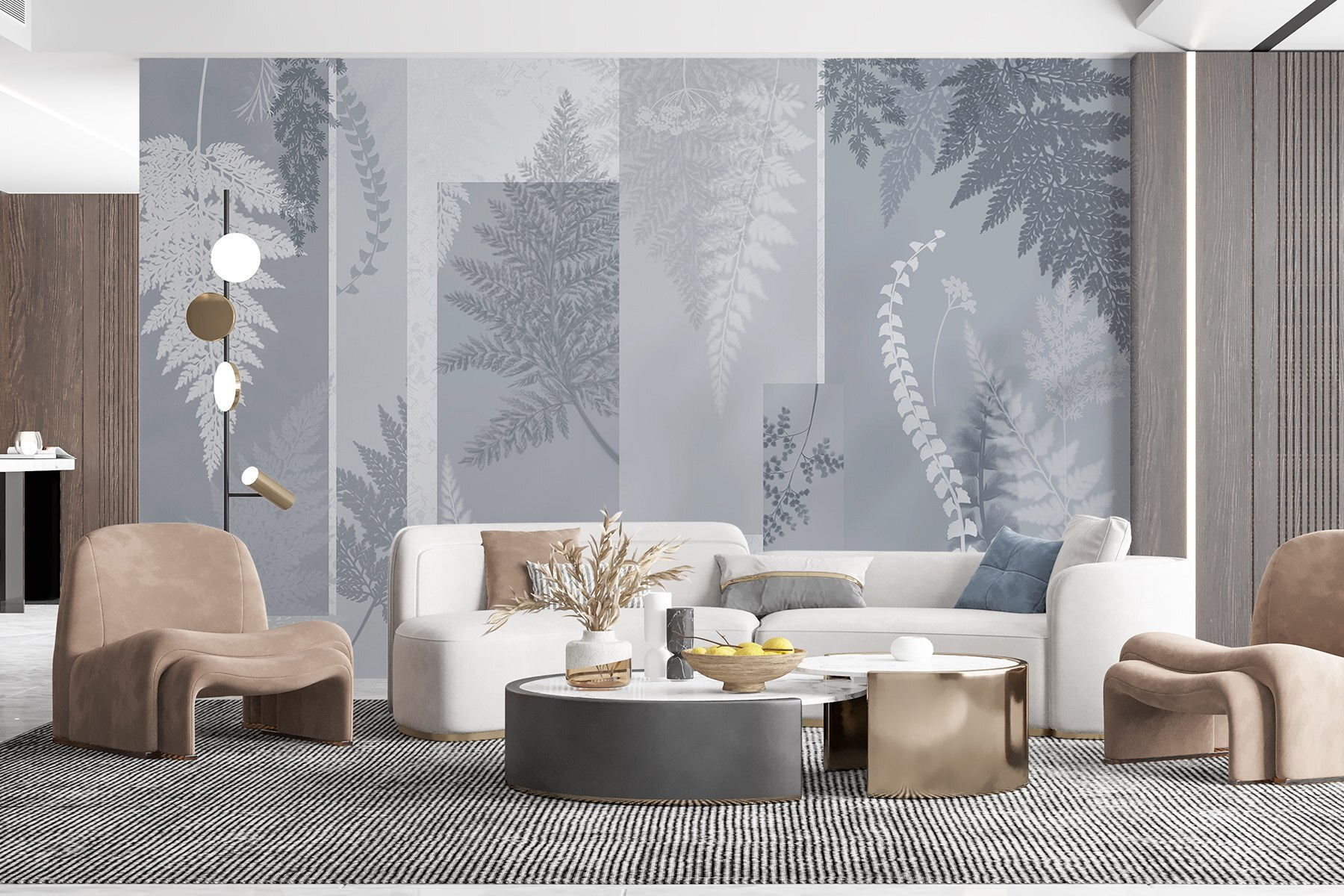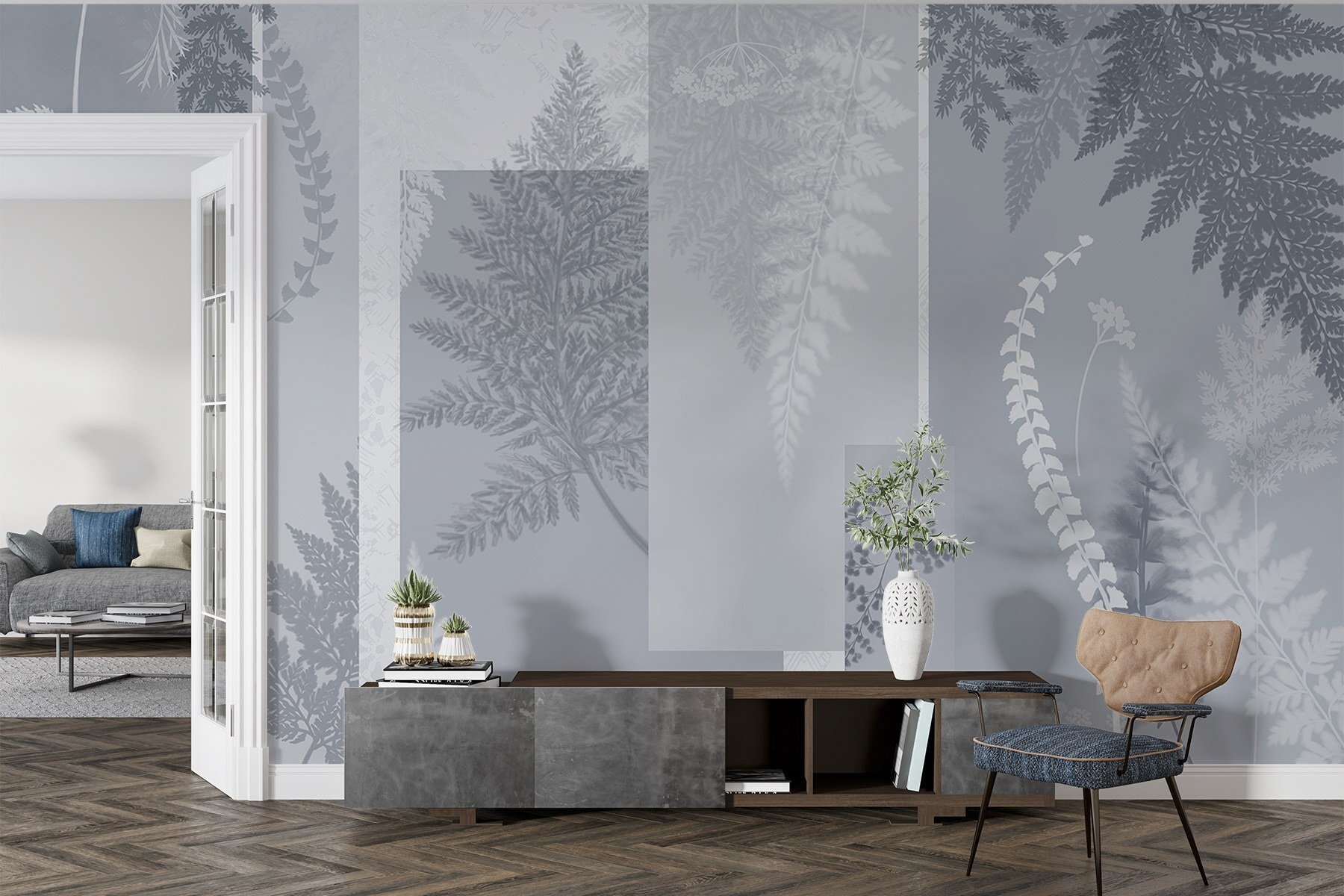 Transformeer elke kamer met deze betoverende grijs-witte bloemenmuurschildering. Het is alsof je een vleugje sereen bos in huis haalt – zonder de vervelende muggen. De delicate patronen van varens en gebladerte wervelen samen in een rustgevende dans, perfect voor gezellige ruimtes of levendige bijeenkomsten. Stel je voor dat je aan je koffie nipt, terwijl het zonlicht de zachte patronen verlicht en een zachte sfeer creëert. Het is het soort decor dat verfijning uitstraalt en toch oh-zo-uitnodigend aanvoelt. Deze muurschildering maakt van elke muur een vredig toevluchtsoord – wie zou dat niet willen?